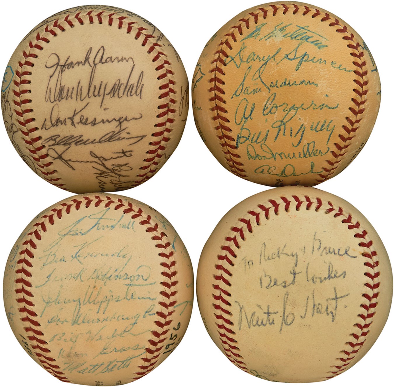 Four star-studded signed specimens are up for grabs in this lot. 1) 1968 NL All-Star on Official National League (Giles) ball, NRMT 24 sigs including Seaver, Carlton, Bench, Aaron, Rose, Gibson, and more (no Clemente). 2) 1953 Giants on Official National League (Giles) ball, 24 sigs including Durocher (sweet spot), B. Thompson, Irvin, Dark, and more (no Mays), EX-MT condition. 3) Official American League (Cronin) personalized by Waite Hoyt, "To Mickey and Bruce," single-signed and in EX-MT condition. 4) 1956 Reds team jammed with a whopping 33 signatures, featuring Flood, Nuxhall, F. Robinson, McMillan, Klu, Post, Bell, Dykes and more on an Official National League (Giles) ball in EX+ condition.