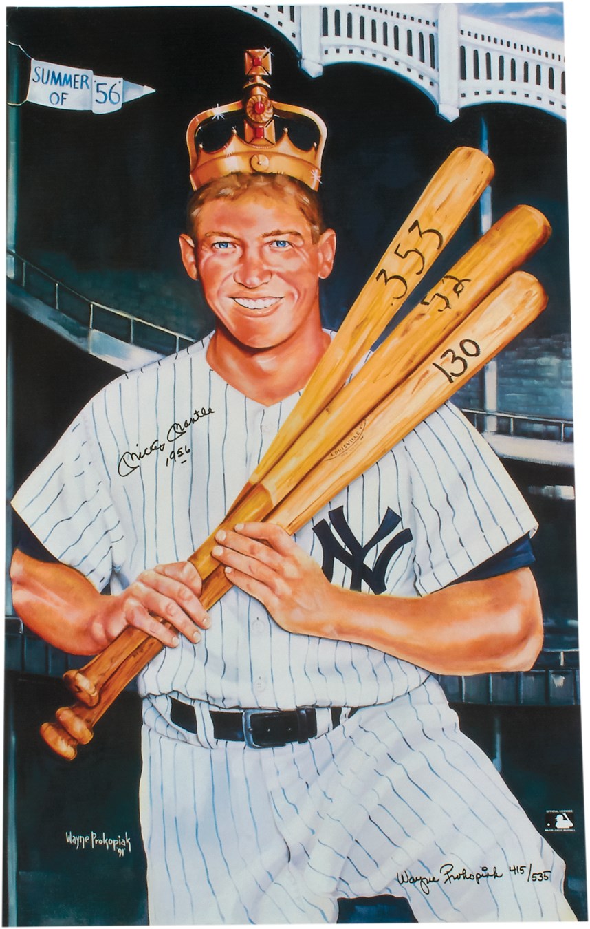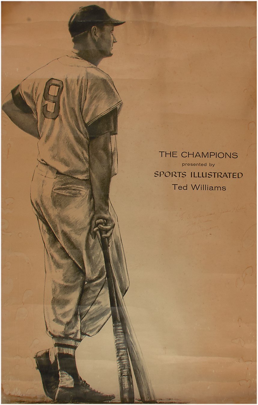 A pair of baseball's all-time greats are highlighted in this lot. Offered is a 22x36" poster celebrating Mickey Mantle's Triple Crown, signed and inscribed "536." It is also signed by artist Wayne Prokopiak and numbered 415/535. Also included is a sizeable 36x58" piece entitled, "The Champions, Presented by Sports Illustrated, Ted Williams." It is signed, "To Walter and Jack Kelly, Best Wishes, Ted Williams" - this used to hang in a Boston sporting goods shop where Walter and Jack were owners. Both are unframed and would make beautiful display pieces.