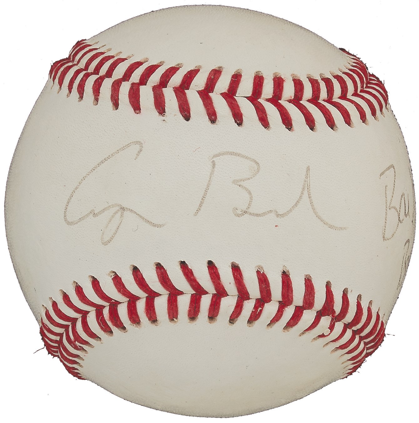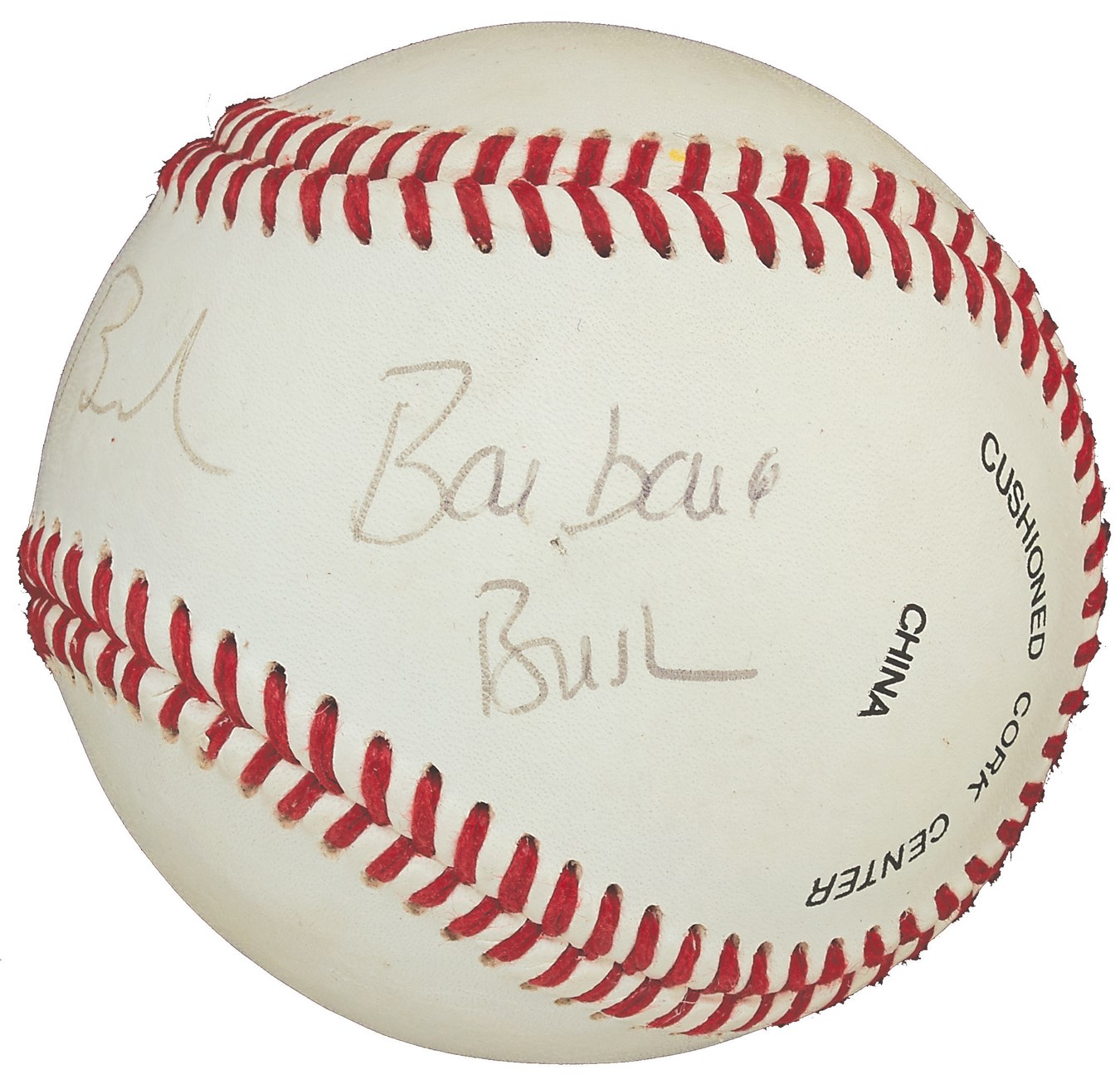 The worlds of baseball and politics combine on this baseball, dual-signed by President George W. Bush and wife Barbara. The Wilson is bright and clean, and both signatures are in black pen. Of course, before he became the 43rd President of the United States, Bush was a part-owner of the Texas Rangers franchise.