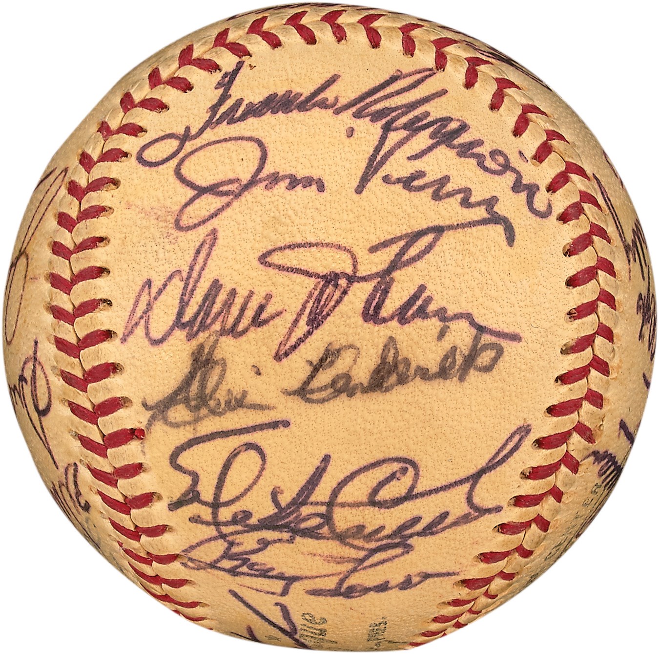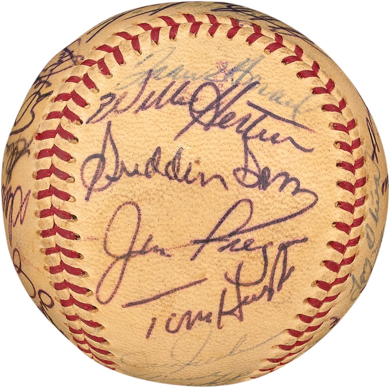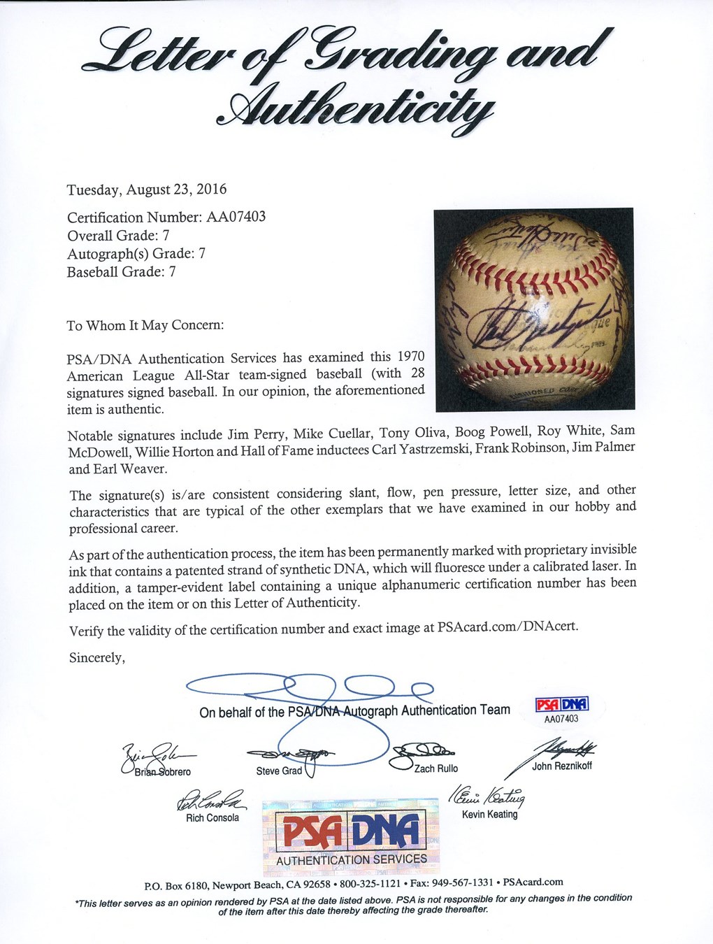Perhaps the most exciting finish to a Major League All-Star Game took place in Cincinnati in 1970 when hometown hero Pete Rose scored the winning run on a Jim Hickman single with two outs in the bottom of the 12th inning after colliding with catcher Ray Fosse at the plate (remember home plate collisions?). From that unforgettable Midsummer Classic comes this Official National League Warren Giles baseball signed by 28 members of the 1970 American League All-Star team. The signatures include: Carl Yastrzemski, Frank Robinson, Jim Palmer, Earl Weaver, Ralph Houk, Boog Powell, Roy White, Sam McDowell, Willie Horton, Jim Perry, Mike Cuellar, Tony Oliva, Davey Johnson, Mel Stottlemyre, Frank Howard and more. Graded overall 7 by PSA/DNA, with a 7 grade each for ball and autographs. Comes with full PSA/DNA LOA.