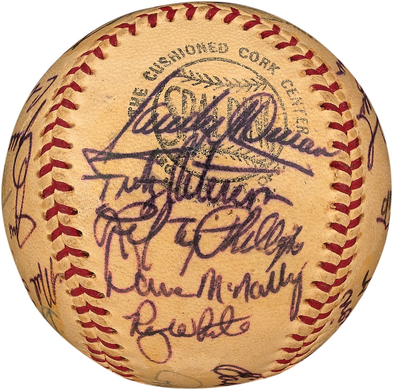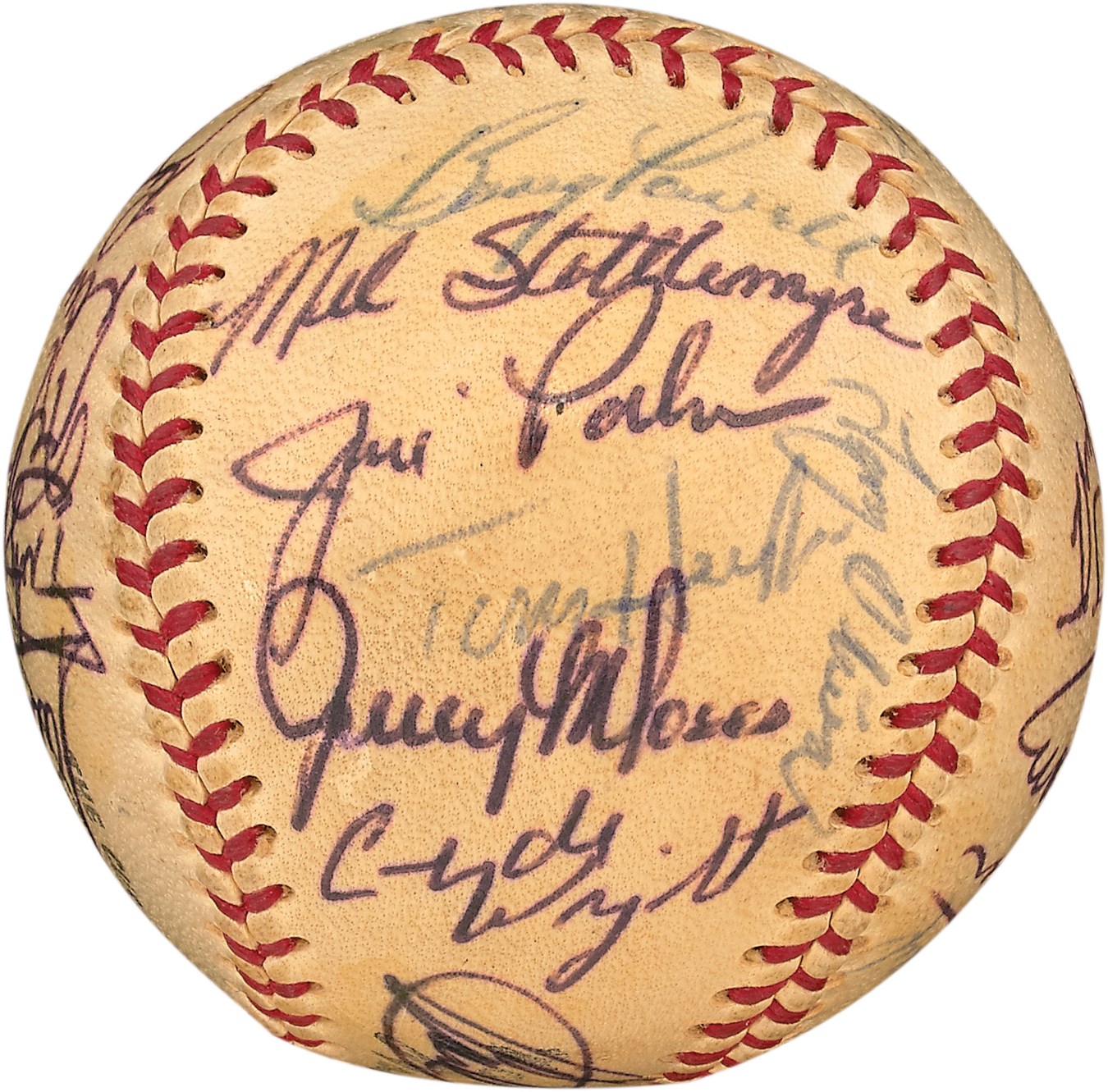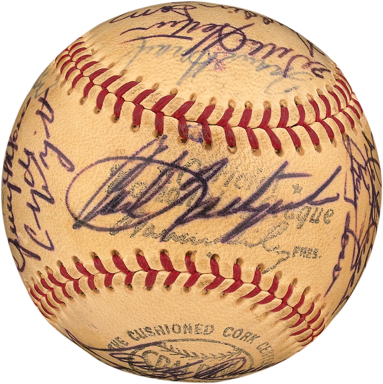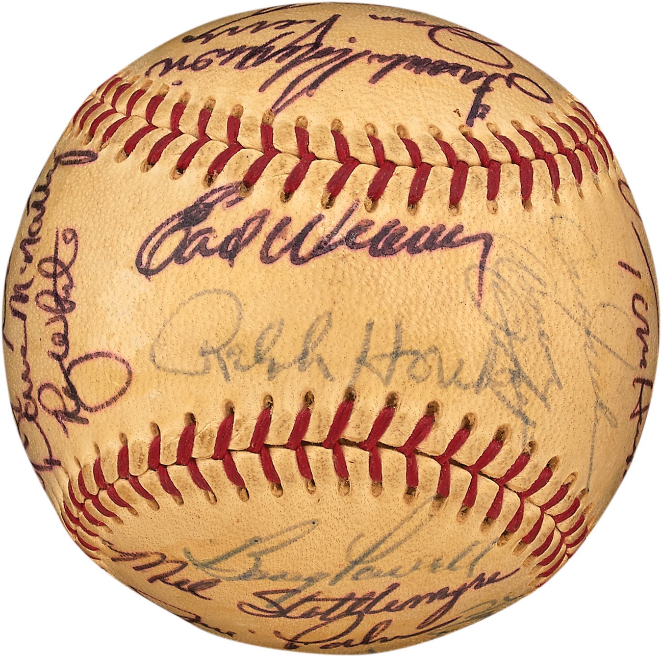 Perhaps the most exciting finish to a Major League All-Star Game took place in Cincinnati in 1970 when hometown hero Pete Rose scored the winning run on a Jim Hickman single with two outs in the bottom of the 12th inning after colliding with catcher Ray Fosse at the plate (remember home plate collisions?). From that unforgettable Midsummer Classic comes this Official National League Warren Giles baseball signed by 28 members of the 1970 American League All-Star team. The signatures include: Carl Yastrzemski, Frank Robinson, Jim Palmer, Earl Weaver, Ralph Houk, Boog Powell, Roy White, Sam McDowell, Willie Horton, Jim Perry, Mike Cuellar, Tony Oliva, Davey Johnson, Mel Stottlemyre, Frank Howard and more. Graded overall 7 by PSA/DNA, with a 7 grade each for ball and autographs. Comes with full PSA/DNA LOA.