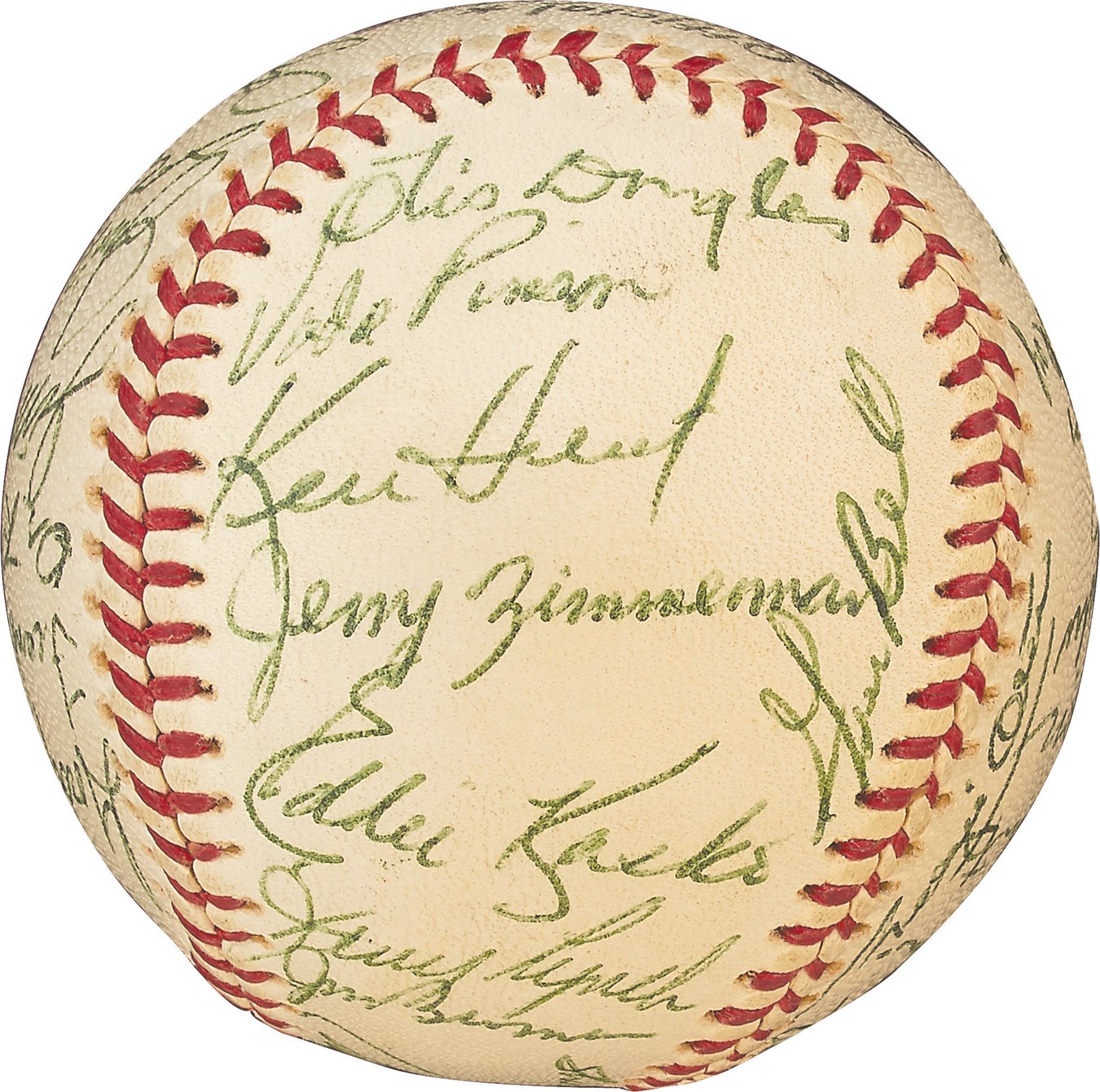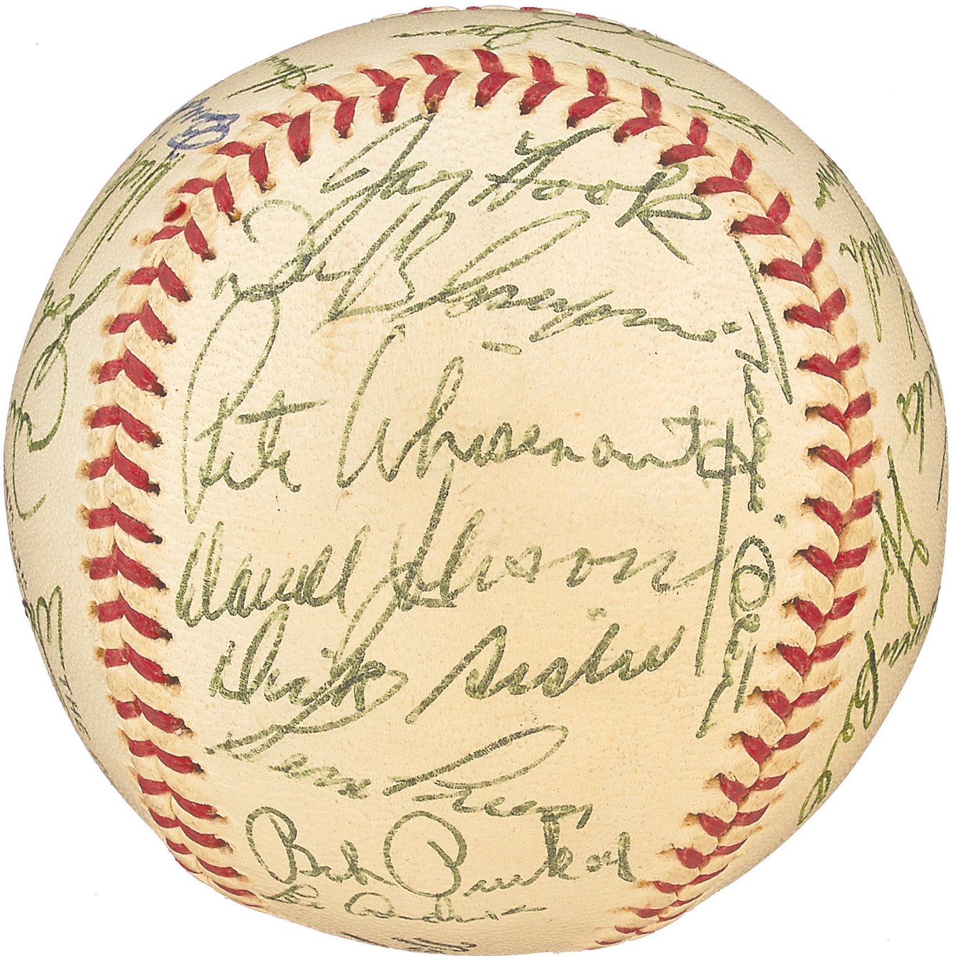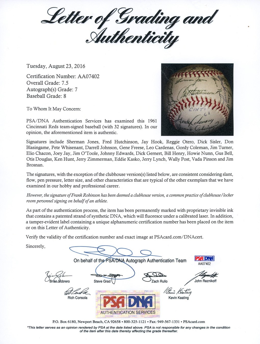 They are the answer to the trivia question: "Which team did the fabled 1961 Yankees vanquish in the World Series?" Yet, the Cincinnati Reds were hardly slouches themselves that season, winning 93 games before falling in five to the M&M Boys and the rest of the Bronx Bombers. Here's a handsome Official National League Warren Giles baseball signed by 32 members of the 1961 National League Champions, including Fred Hutchinson (ss), Sherman Jones, Jay Hook, Reggie Otero, Dick Sisler, Don Blasingame, Pete Whisenant, Darrell Johnson, Gene Freese, Leo Cardenas, Gordy Coleman, Jim Turner, Elio Chacon, Joey Jay, Jim O'Toole, Johnny Edwards, Dick Gernert, Bill Henry, Howie Nunn, Gus Bell, Otis Douglas, Ken Hunt, Jerry Zimmerman, Eddie Kasko, Jerry Lynch, Wally Post, Vada Pinson and Jim Brosnan. Frank Robinson's signature has been deemed a clubhouse version. Graded overall 7.5 by PSA/DNA, the autographs grade a collective 7, while the ball grades an 8. Encased in a PSA/DNA cube.