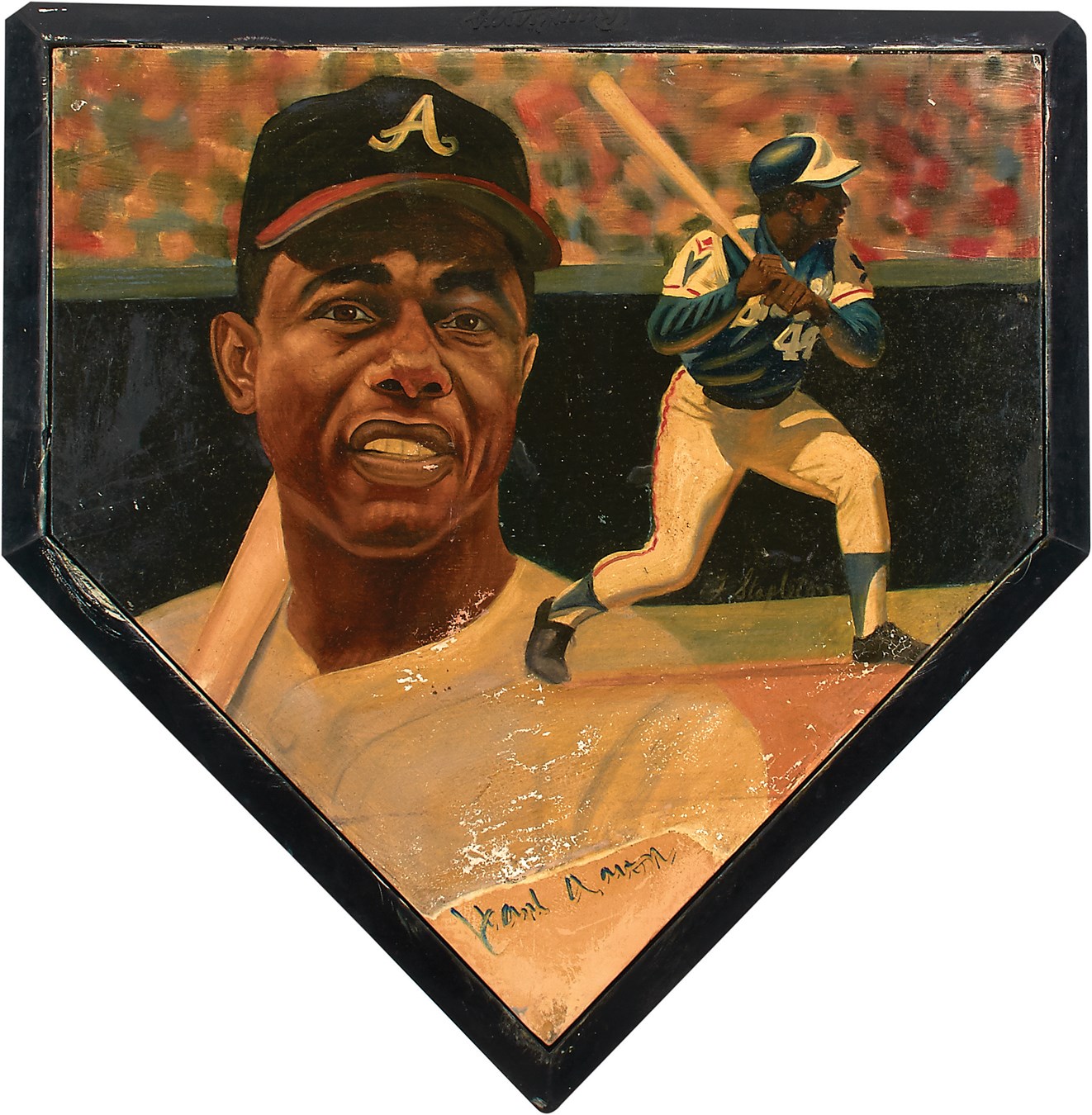 As a ballplayer, Hammerin' Hank was nothing short of an artist when working at home plate. And this magnificent depiction of the Hall of Fame legend by artist Frank Stapleton is bursting with color and style, perfectly capturing Aaron's strength and intensity. Both men signed the 19x19" artwork with pride, and it dates to 1996. Comes with an LOA from JSA for the autograph and the condition is VG-EX overall.