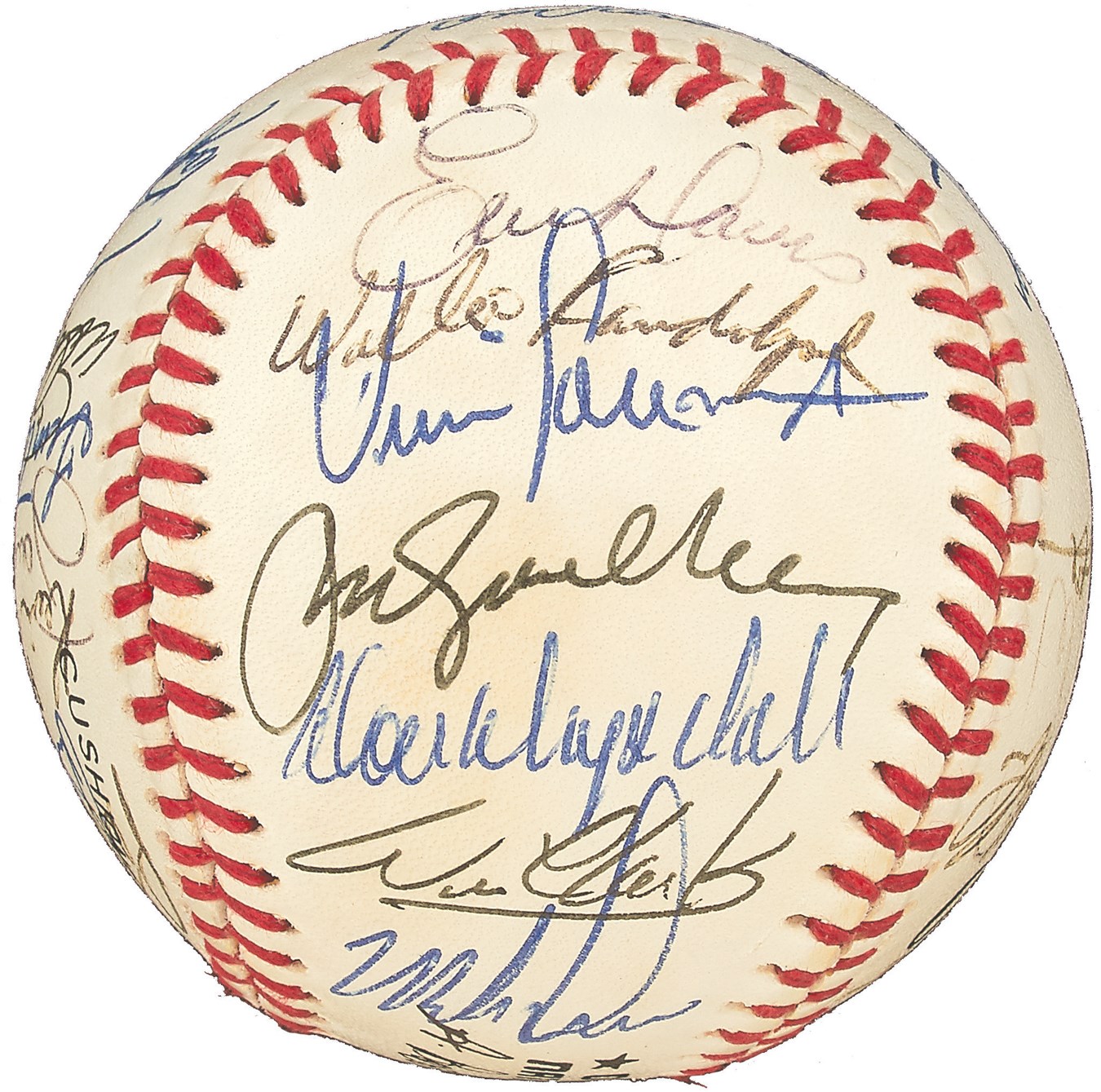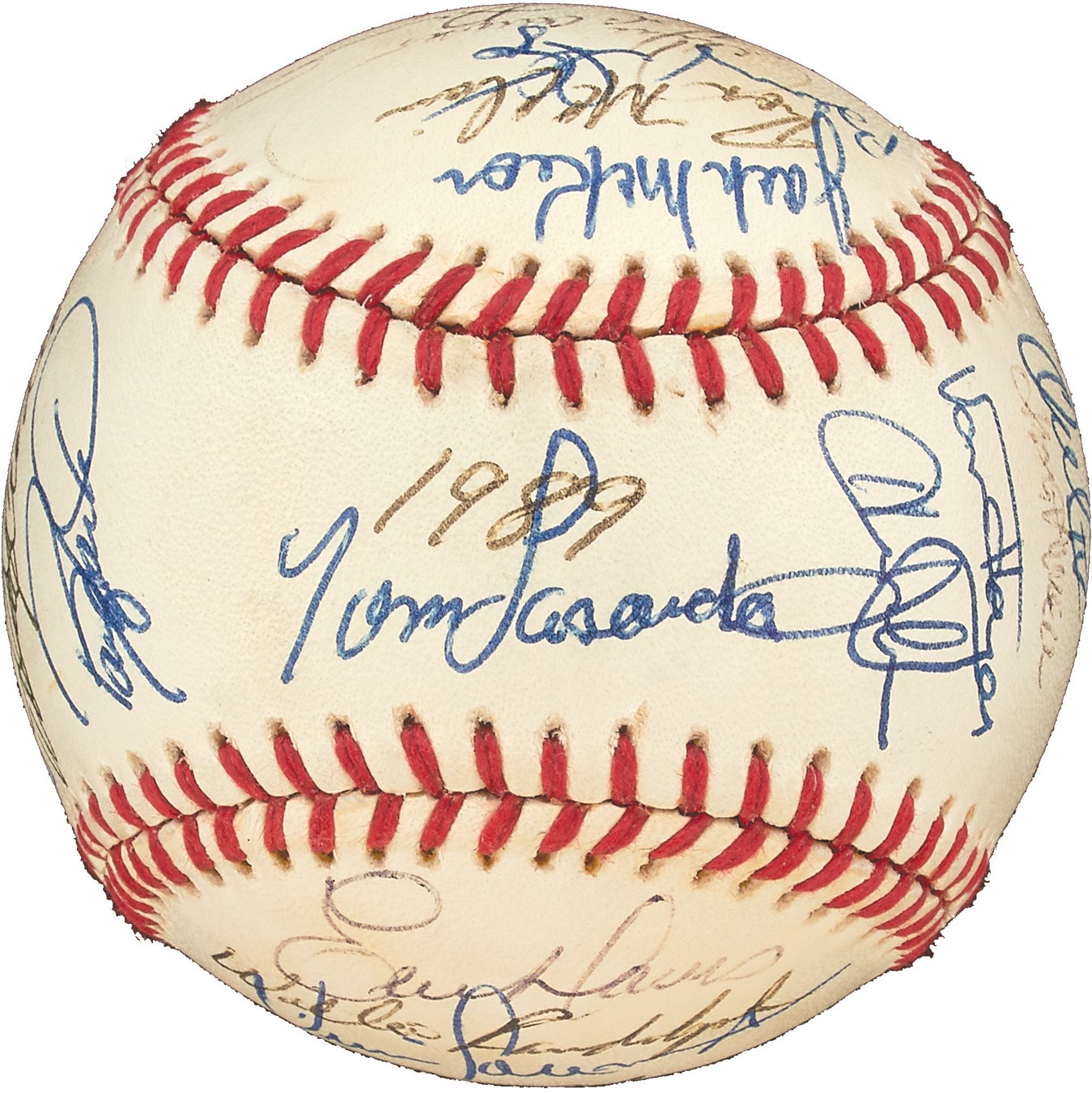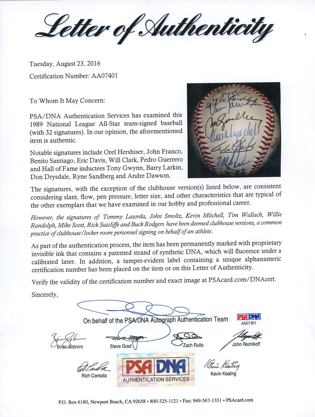 A Who's Who of baseball greats are represented on this Official National League Bart Giamatti baseball signed by 24 members of the 1989 National League All-Star Team, which lost a 5-3 decision in Anaheim. The signatures include: Don Drysdale, Ryne Sandberg, Tony Gwynn, Barry Larkin, Andre Dawson, Eric Davis, Orel Hershiser, John Franco, Benito Santiago, Will Clark, Pedro Guerrero and Howard Johnson. There are additional clubhouse signatures from: Tommy Lasorda, John Smoltz, Kevin Mitchell, Tim Wallach, Willie Randolph, Mike Scott, Rick Sutcliffe and Buck Rodgers. Other than the "1989" written on the sweet spot, the ball itself is MINT and comes with PSA/DNA LOA.