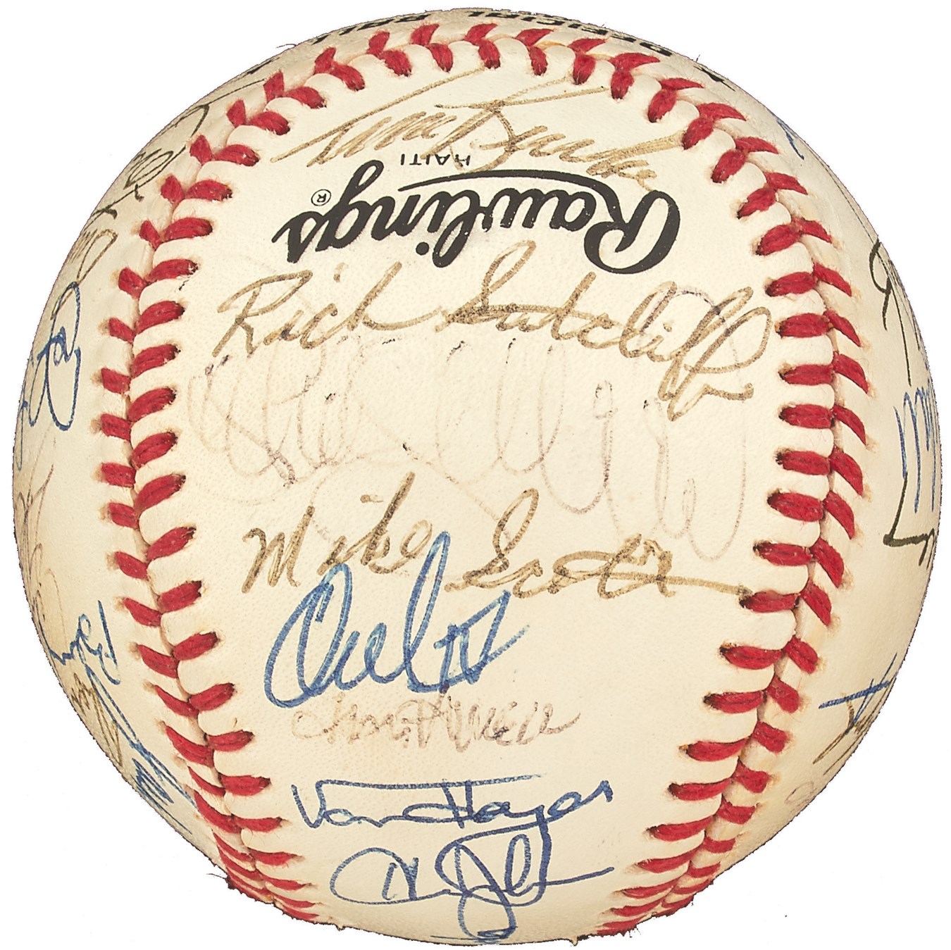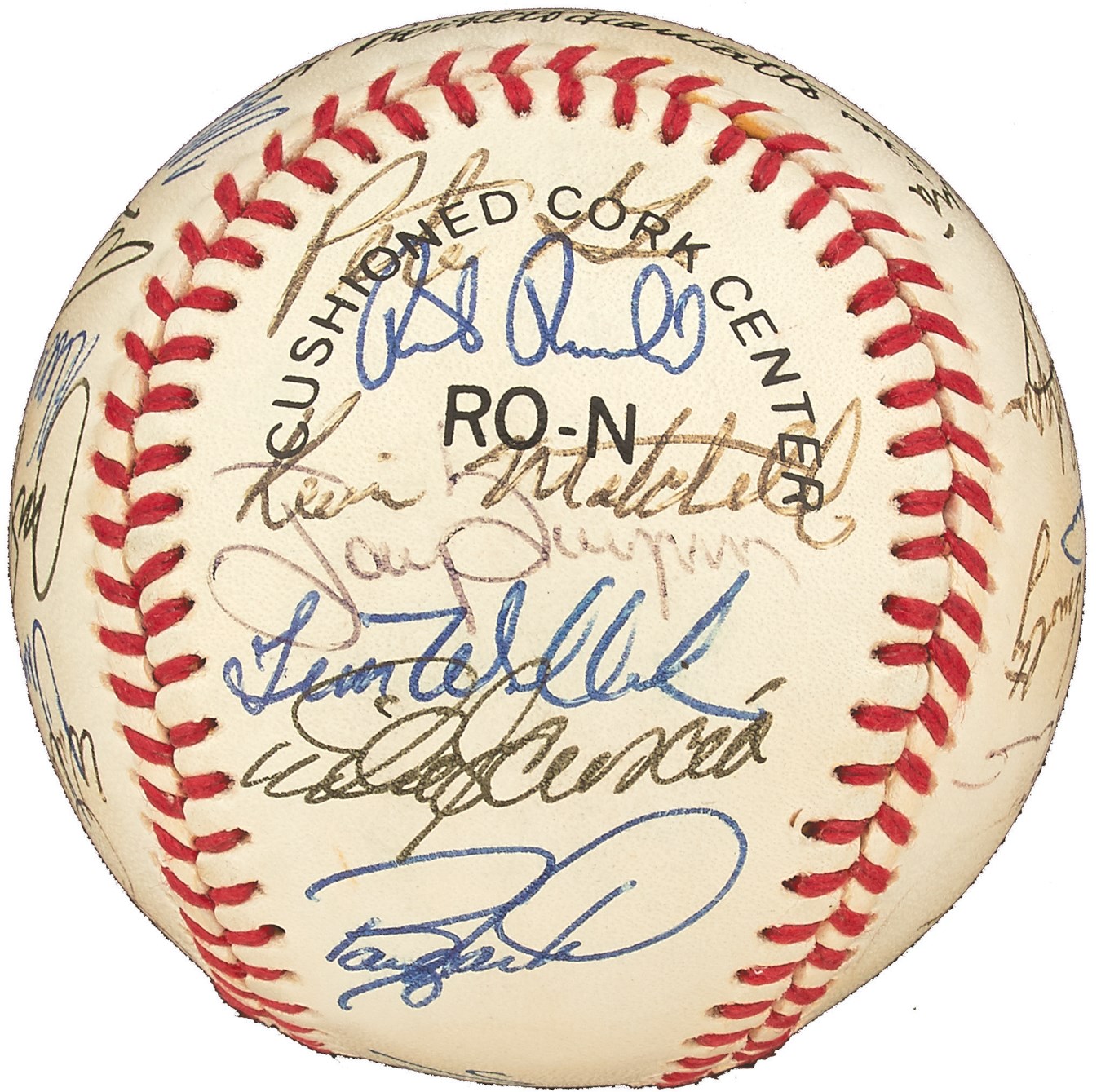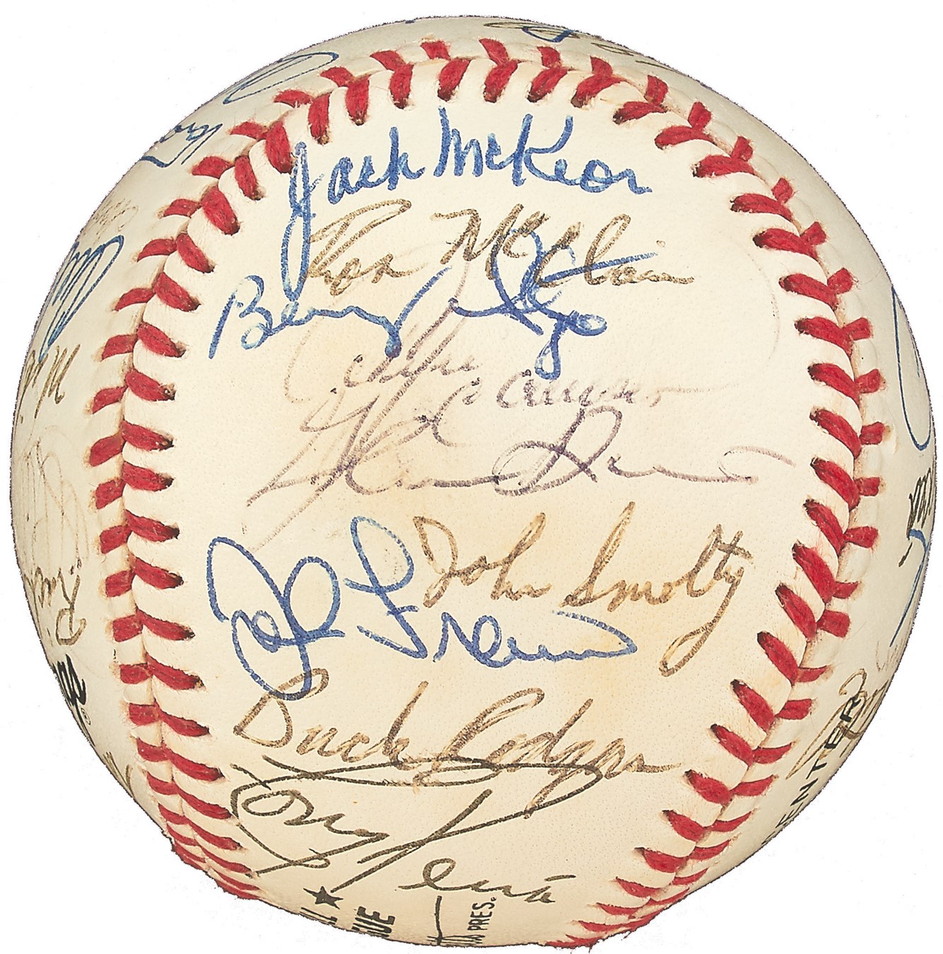 A Who's Who of baseball greats are represented on this Official National League Bart Giamatti baseball signed by 24 members of the 1989 National League All-Star Team, which lost a 5-3 decision in Anaheim. The signatures include: Don Drysdale, Ryne Sandberg, Tony Gwynn, Barry Larkin, Andre Dawson, Eric Davis, Orel Hershiser, John Franco, Benito Santiago, Will Clark, Pedro Guerrero and Howard Johnson. There are additional clubhouse signatures from: Tommy Lasorda, John Smoltz, Kevin Mitchell, Tim Wallach, Willie Randolph, Mike Scott, Rick Sutcliffe and Buck Rodgers. Other than the "1989" written on the sweet spot, the ball itself is MINT and comes with PSA/DNA LOA.