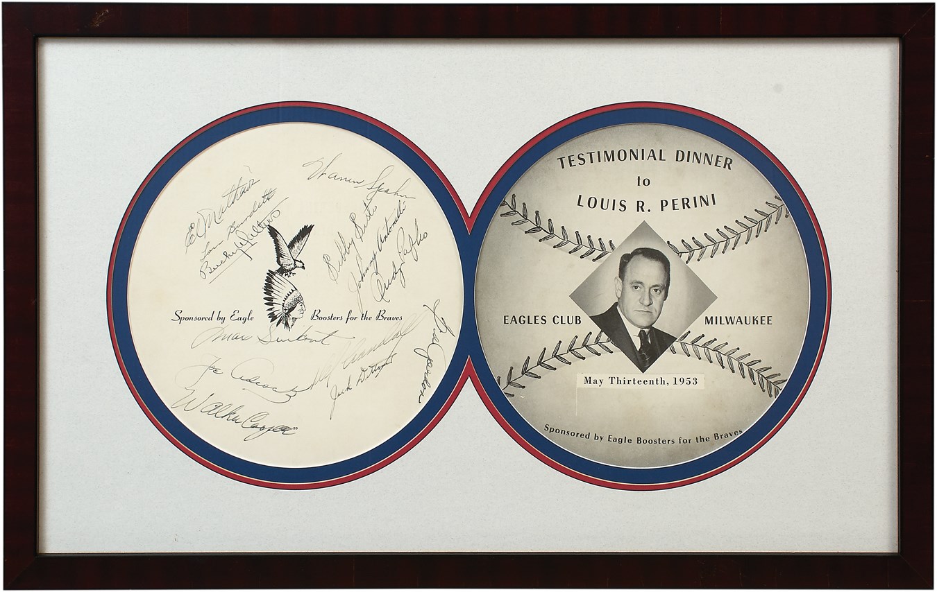 The man who oversaw the Braves' move from Boston to Milwaukee in 1953 - Lou Perini - is the subject of this die-cut testimonial program that is fashioned like a baseball and features the owner's photo on the cover. Framed with double-sided glass, the program is signed by 13 mostly Boston Braves including Spahn, Mathews, Burdette, Pafko, Adcock, Walters, Gordon and Crandall. It measures 21x14" framed and is in EX condition.