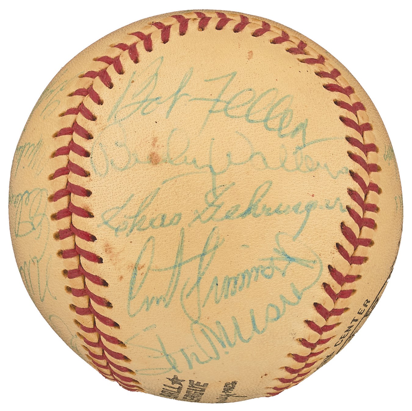 A great selection of old-timers, most of which are Hall of Famers, are on this circa 1974 baseball. The Official National League (Feeney) baseball is EX-MT with 20 ink signatures that average 5-6/10, highlighted by Mantle & Medwick on sweet spot, with other luminaries including: Elston Howard, Nellie Fox, Feller, Musial, Gehringer, Ruffing, Grove, and more.