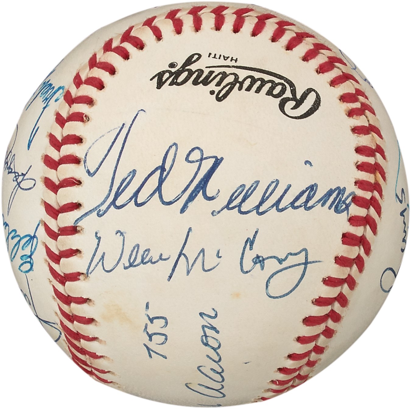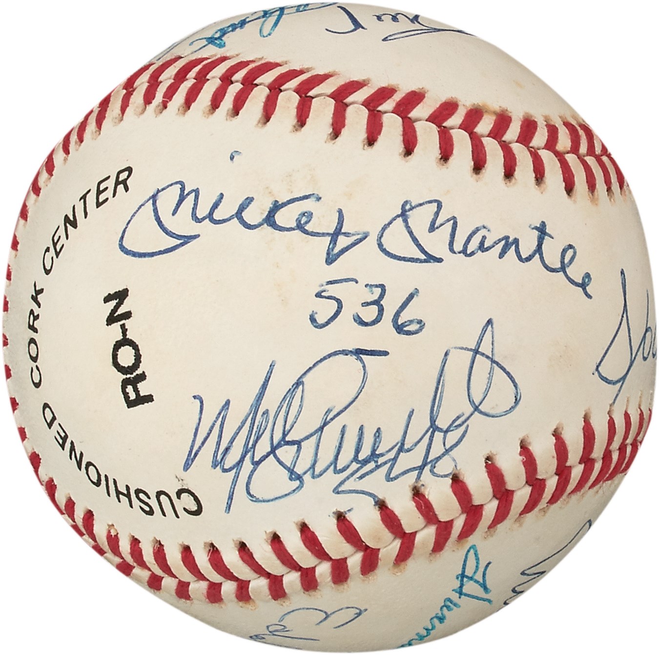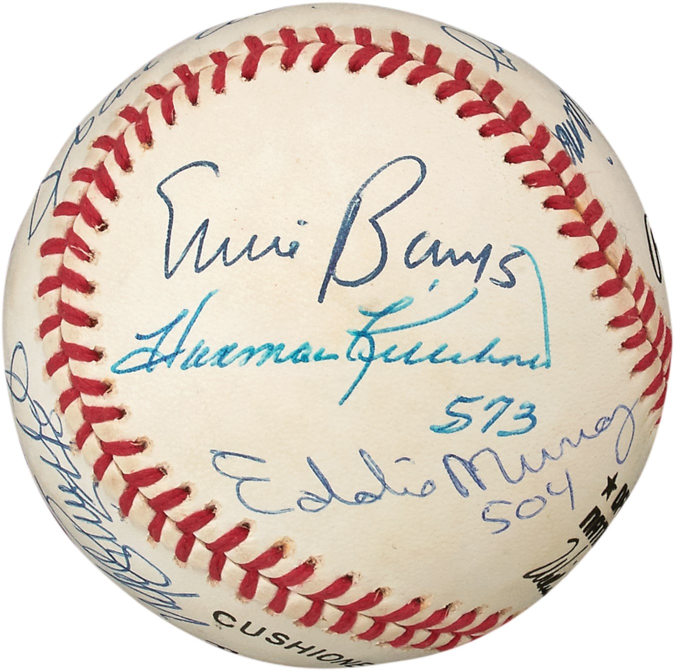 Twelve of the 27 members of baseball's elite 500 Home Run Club are well-represented on this signed Official National League baseball. What makes the ball exceptionally rare is that some of the sluggers inscribed their homer totals on the cowhide. These include: Mickey Mantle 536, Ted Williams, Willie Mays, Hank Aaron 755, Willie McCovey, Mike Schmidt 548, Ernie Banks, Harmon Killebrew 573, Eddie Murray 504, Eddie Mathews, Reggie Jackson and Frank Robinson. There's a minor smudge on the Reggie Jackson autograph and a few minor spots, but they hardly detract from a terrific collectible. Comes with PSA LOA.