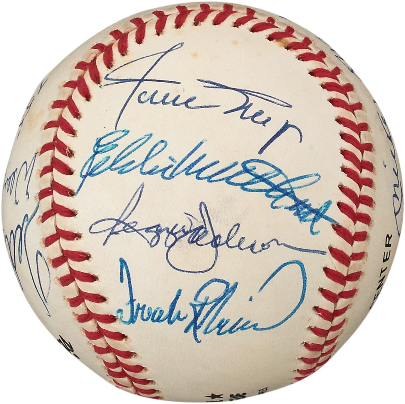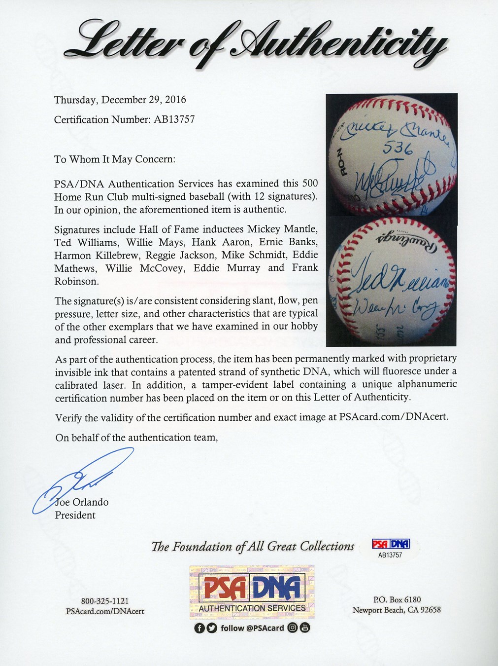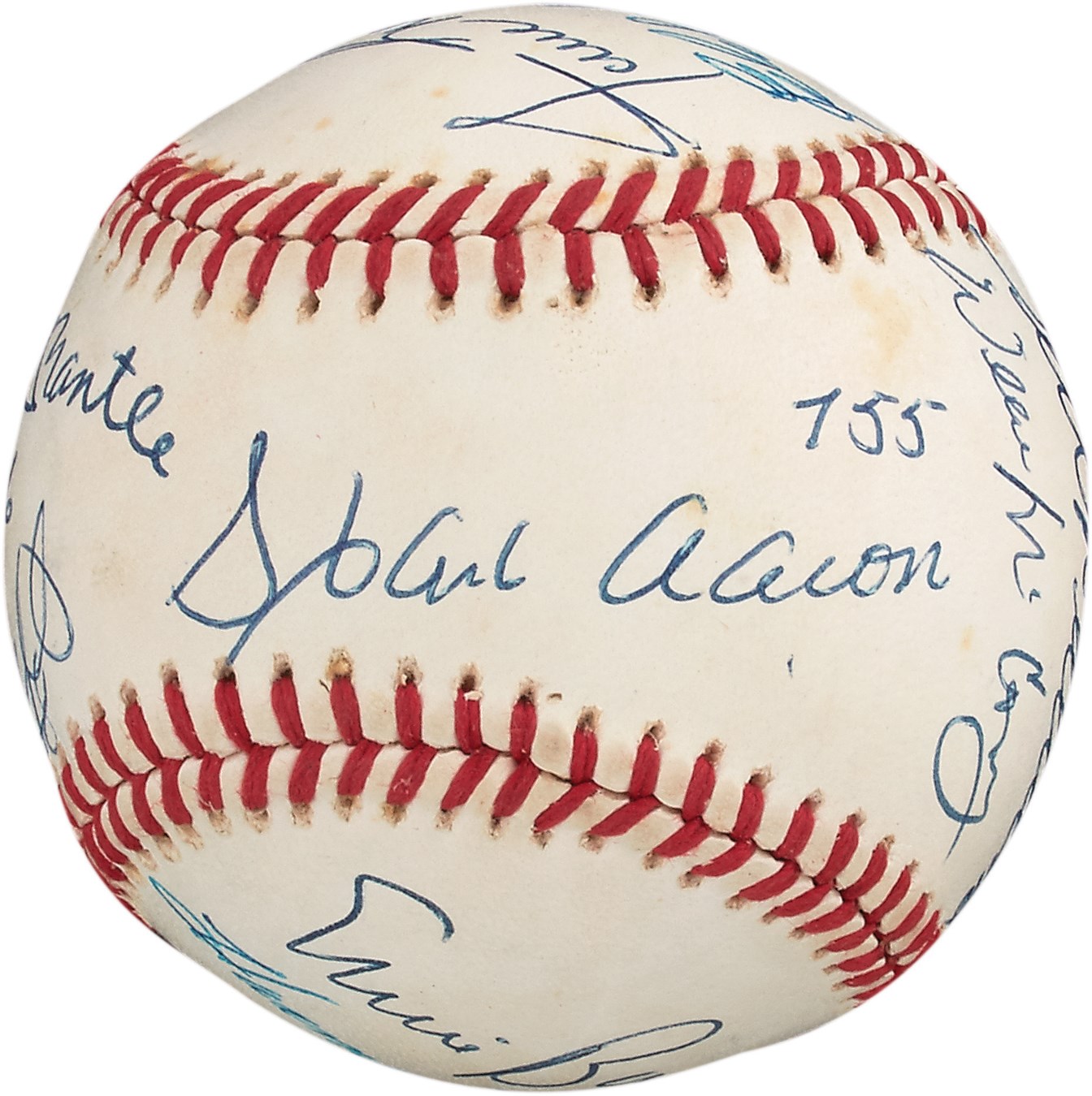 Twelve of the 27 members of baseball's elite 500 Home Run Club are well-represented on this signed Official National League baseball. What makes the ball exceptionally rare is that some of the sluggers inscribed their homer totals on the cowhide. These include: Mickey Mantle 536, Ted Williams, Willie Mays, Hank Aaron 755, Willie McCovey, Mike Schmidt 548, Ernie Banks, Harmon Killebrew 573, Eddie Murray 504, Eddie Mathews, Reggie Jackson and Frank Robinson. There's a minor smudge on the Reggie Jackson autograph and a few minor spots, but they hardly detract from a terrific collectible. Comes with PSA LOA.