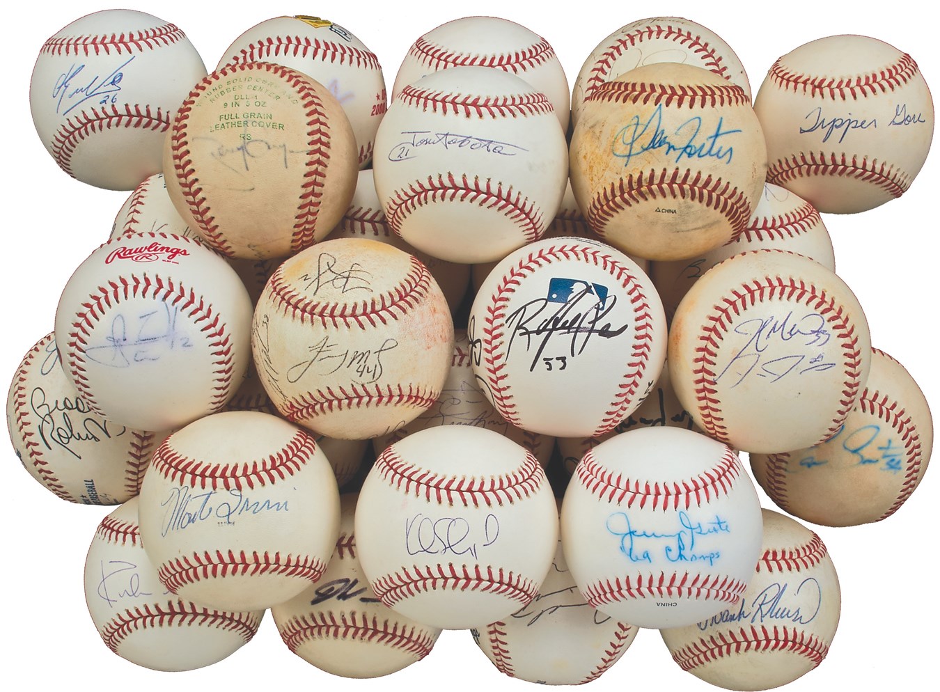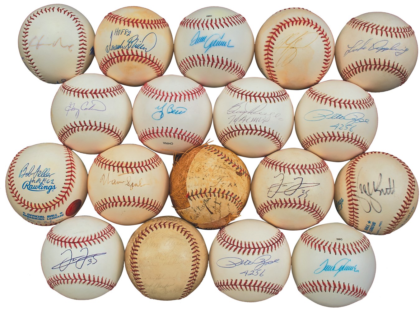 Roughly six-dozen baseballs highlight this terrific collection, which includes single-, multi-, and team-signed examples. Among the highlights: a partial 1932 Tour ball with partial Jimmie Foxx, Lefty O'Doul and Rabbit Warstler; a 1962 Braves team signed, game-used ball with Mathews & Spahn (very light); plus Mike Piazza, Hideo Nomo, Tom Seaver, Yogi Berra, Warren Spahn, Gary Carter, Frank Thomas, Pete Rose "4256," Frank Robinson "HOF 82," George Brett, Alex Rodriguez, Luke Appling, Bob Feller & Bo Belinsky inscribed no-hitter ball, and lots more. In general, the balls show some toning and spotting with fading signatures, but overall appear EX. Some have been authenticated by JSA.