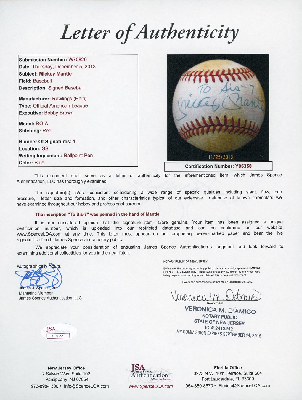 Here's something of an usual offering - while Mickey Mantle's signature graces many pieces, this one was actually inscribed to his sister, Barbara. The Official American League (Brown) ball bears The Mick's signature in blue ballpoint ink on the sweet spot below the inscription "To Sis - 7," which is also deemed to be in Mantle's hand. Stampings are clear though the ball has some toning, particularly on the panels. This lot is accompanied by JSA LOA.