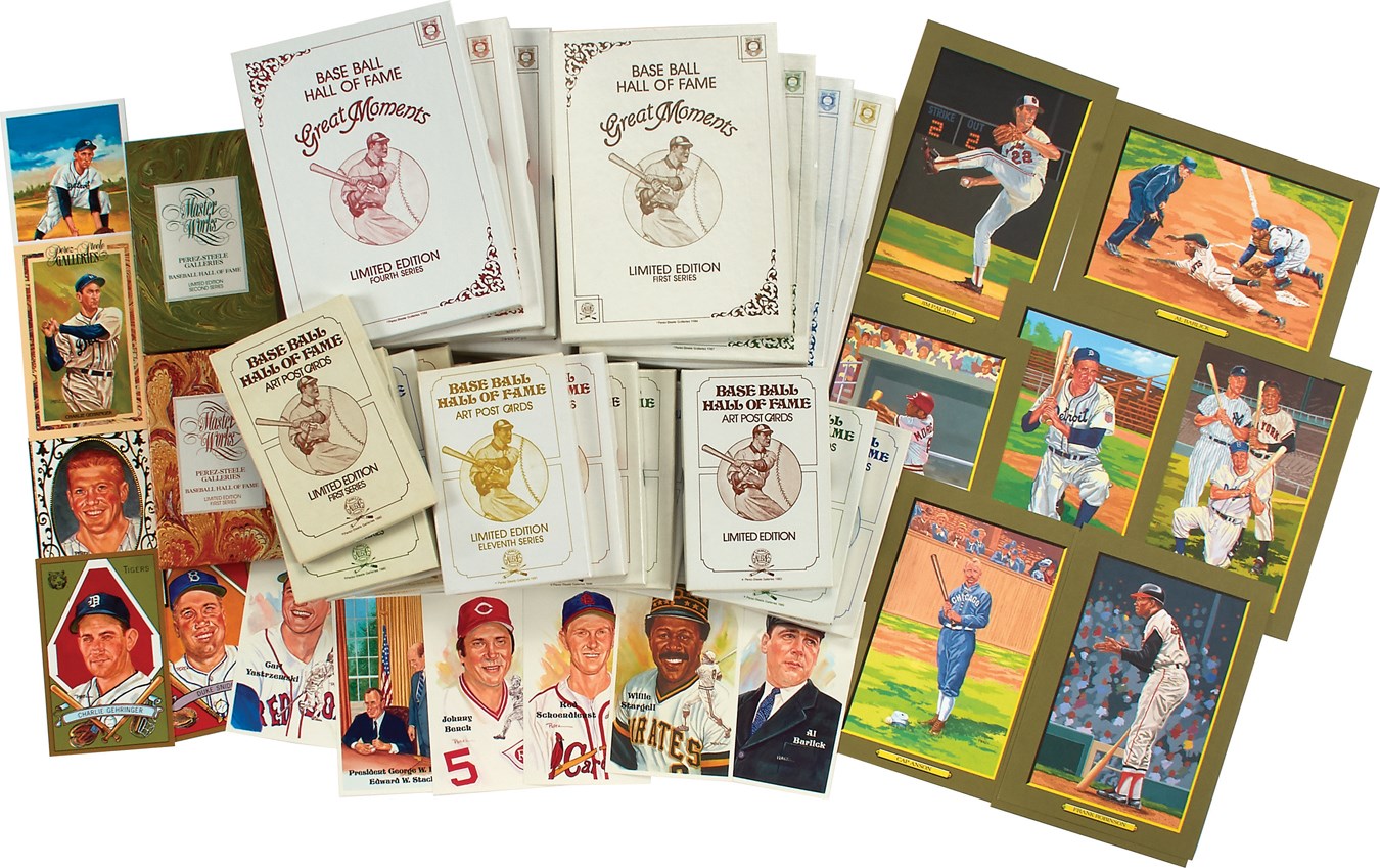 Perez Steele postcards are legendary for their artistry and that is applied to this amazing set of cards, all of which are in original boxes and in MINT condition. Included are Series 1-15 of the Limited Edition 3.5x5.5" Hall of Fame postcards, in addition to 1st and 2nd Edition Master Works sets. Rounding out this stellar selection is Series 1-9 of the larger-sized 6x8" Limited Edition Baseball Hall of Game Great Moments set. Individually, each of these cards is a significant collectible, but to find a set of this size and quality is the mother lode of Perez Steele finery.