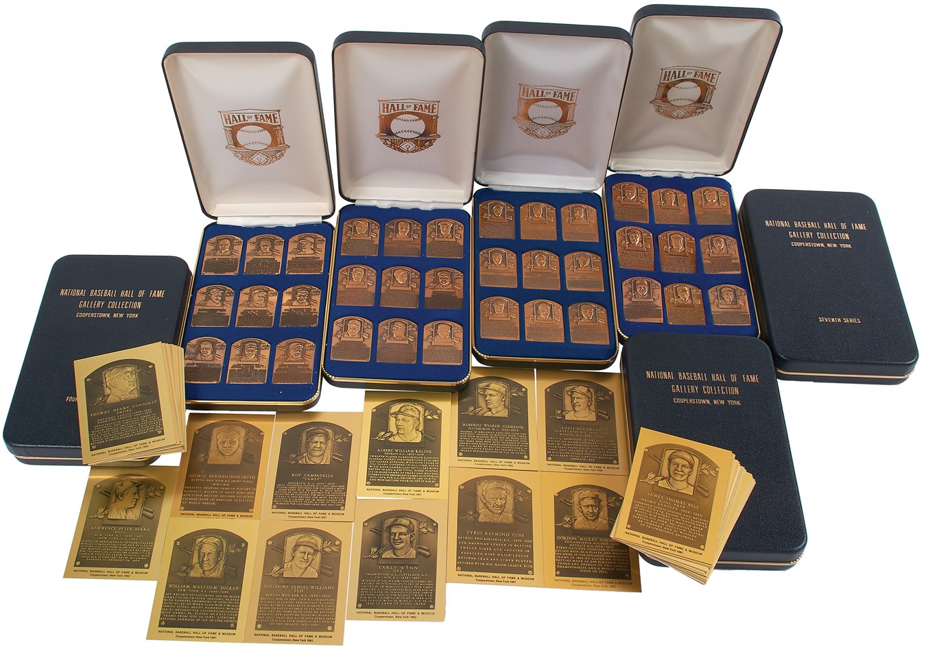 Baseball Hall of Fame collections: 1) Series 1-7 of the National Baseball Hall of Fame Gallery Collection boxed sets, each handsome blue satin lined fitted case contains nine different bronze Hall of Fame mini-plaques. Hall of Fame logo in gold, plaques include Hank Aaron, Willie Mays, Hack Wilson, Ernie Banks, Mickey Mantle, Sandy Koufax, Josh Gibson, Roberto Clemente and Yogi Berra. Each box contains nine of the 63 plaques in total. Boxes measure 7x4", Mint in original cartons and paperwork. 2) Hall of Fame special set of (204) metallic plaque cards included every player, executive, manager and umpire thru 1989. Each 2.5x 3.5" gold anodized aluminum card bears an exact replica of the player's official Hall of Fame plaque. The sets were limited to 1,000, this is the entire set and the supplements issued and sold through the Hall of Fame Gift Shop through 1989. Condition is MINT.