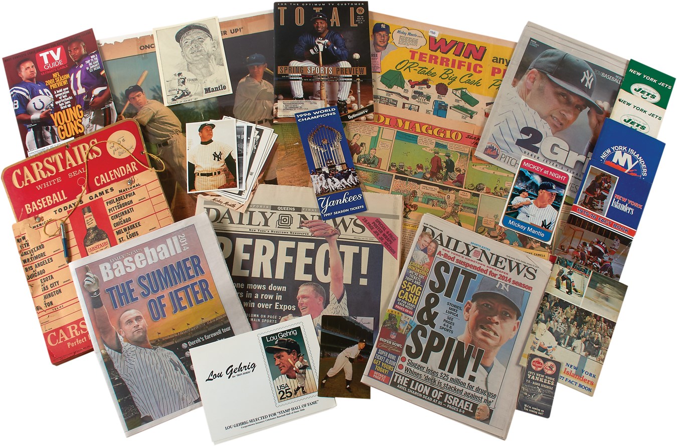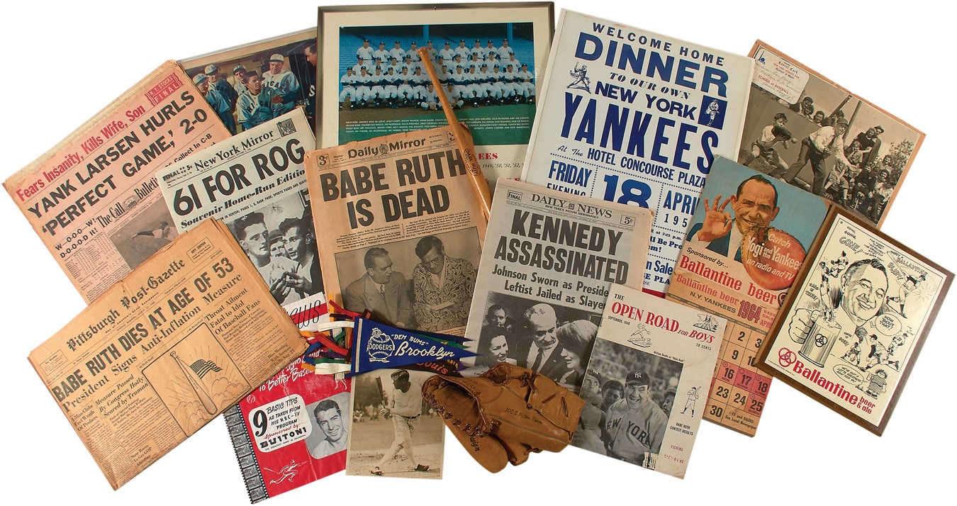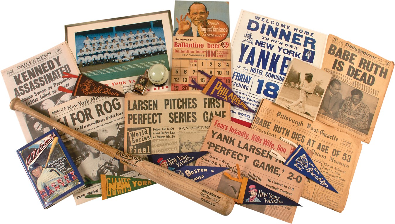 Offered is a plethora of over 300 pieces of sports history from some of the greatest athletes and teams of all-time. There is a little bit of everything from gloves, photos, books and vintage posters to game used memorabilia, autographs and much more! Some of the highlights of the collection include: 1) Tino Martinez game used Yankees bat. 2) Mickey Mantle signed book. 3) 1930s Babe Ruth Type I Photo (PSA LOA). 4-5) Gloves: Mickey Mantle Triple Crown and Gil Hodges Denkert. 6) Christy Walsh signed photo to former 3x Yankee Champion Benny Bengough. 7-15) Vintage mini-pennants: Yankees (2), Dodgers, Philadelphia A's, Boston Braves, St. Louis Browns, New York Giants and more. 16-20) Ballantine Beer items: Yogi Berra advertising calendar, 1953 World Champion Yankees team photo advertisement, Welcome Home Yankees poster, Mel Allen scroll and one other advertising photograph. 21-26) Historic newspapers: Roger Maris' 61st HR, Don Larsen's Perfect Game (2), Babe Ruth's 3HRs in World Series game, Lou Gehrig forced to quit baseball 6/22/39 and JFK's assassination. 27) Mickey Mantle & Roger Maris HR Twins hat. 28) "Bang the Drum Slowly" movie poster. 29) Jack Dempsey "Dempsey's Blended Whiskey" bottle. 30) Joe DiMaggio mini bank. 31-33) Pepsi-Cola and Schlitz advertising trays. 34) 1959 Yankees World Series yearbook. Great collection of material spanning from the 1930s to 2000s including some of the greatest Yankee and Dodger teams, perfect for any collector.