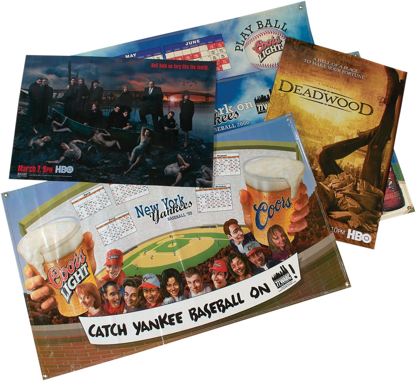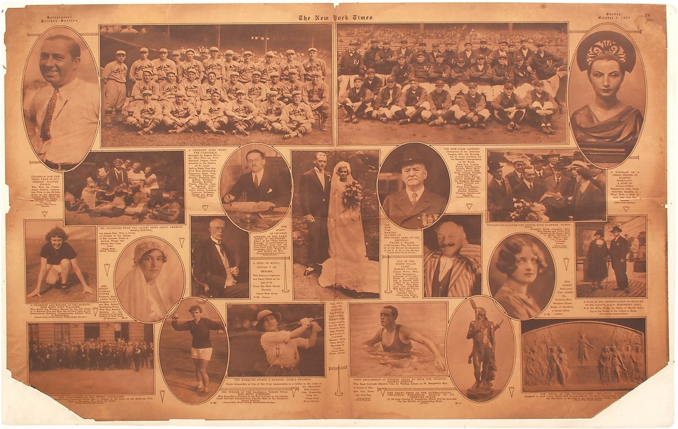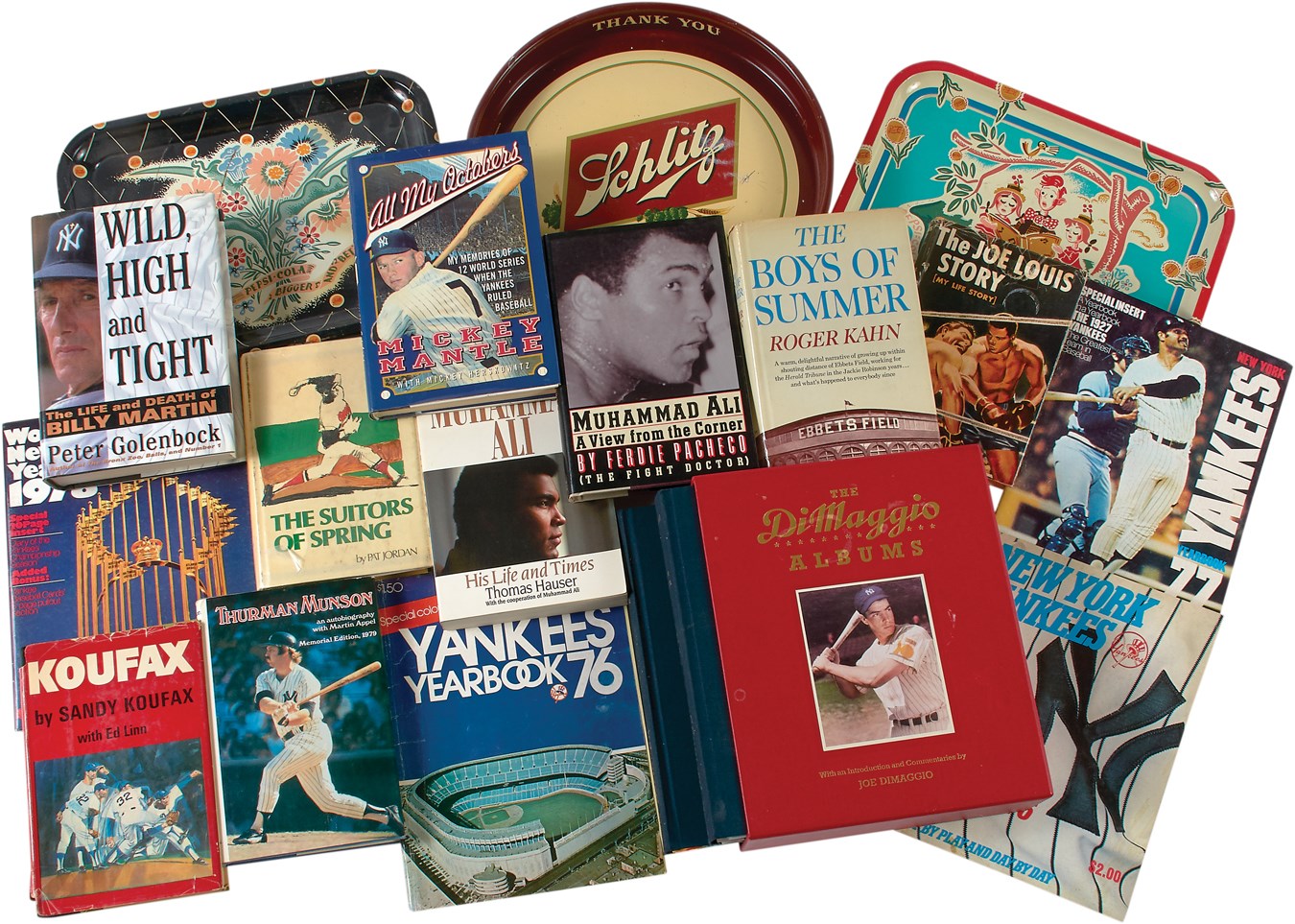 Offered is a plethora of over 300 pieces of sports history from some of the greatest athletes and teams of all-time. There is a little bit of everything from gloves, photos, books and vintage posters to game used memorabilia, autographs and much more! Some of the highlights of the collection include: 1) Tino Martinez game used Yankees bat. 2) Mickey Mantle signed book. 3) 1930s Babe Ruth Type I Photo (PSA LOA). 4-5) Gloves: Mickey Mantle Triple Crown and Gil Hodges Denkert. 6) Christy Walsh signed photo to former 3x Yankee Champion Benny Bengough. 7-15) Vintage mini-pennants: Yankees (2), Dodgers, Philadelphia A's, Boston Braves, St. Louis Browns, New York Giants and more. 16-20) Ballantine Beer items: Yogi Berra advertising calendar, 1953 World Champion Yankees team photo advertisement, Welcome Home Yankees poster, Mel Allen scroll and one other advertising photograph. 21-26) Historic newspapers: Roger Maris' 61st HR, Don Larsen's Perfect Game (2), Babe Ruth's 3HRs in World Series game, Lou Gehrig forced to quit baseball 6/22/39 and JFK's assassination. 27) Mickey Mantle & Roger Maris HR Twins hat. 28) "Bang the Drum Slowly" movie poster. 29) Jack Dempsey "Dempsey's Blended Whiskey" bottle. 30) Joe DiMaggio mini bank. 31-33) Pepsi-Cola and Schlitz advertising trays. 34) 1959 Yankees World Series yearbook. Great collection of material spanning from the 1930s to 2000s including some of the greatest Yankee and Dodger teams, perfect for any collector.