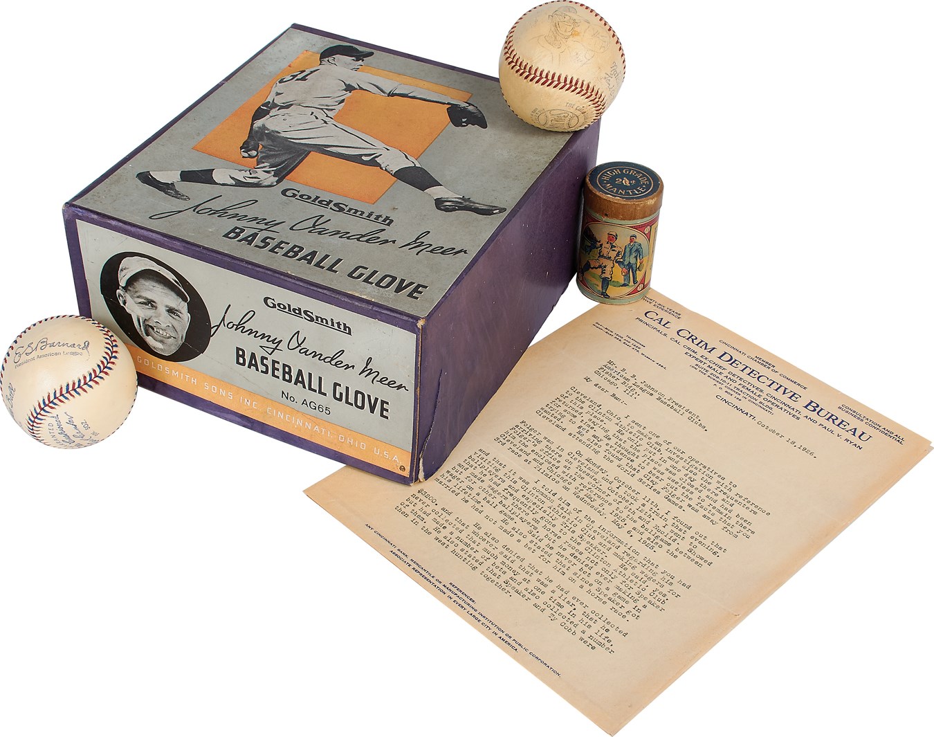 Five baseball curiosities comprise this lot, including an offensive 1940s baseball with artist-signed racist pencil cartoon of a bespectacled black ballplayer with cartoon balloon reading: "Yas Suh!" The Official National League (Frick) baseball is housed in its original box. Also included here are an early 1900s Frankel Light Company original box with baseball player litho that housed a mantle for gas lanterns; Official American League (E.S. Barnard) Mint ball from 1925 with patent; Goldsmith Johnny Vander Meer Baseball Glove original box (empty); and Cal Crim Detective Bureau letter from 1926 to American League President Ban Johnson detailing an investigation into someone named Clay Folger. Major Leaguers Tris Speaker and Ty Cobb are specifically named in the three-page letter though not incriminated.