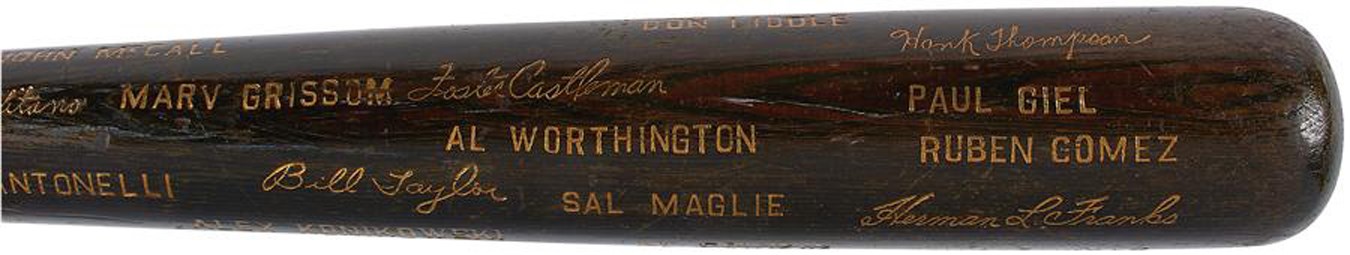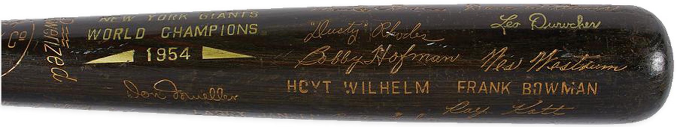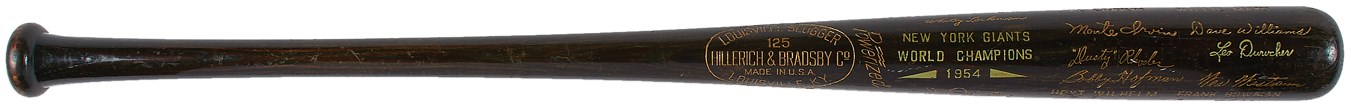 The 1954 World Series will forever be remembered for "The Catch" in Game 1 by center fielder Willie Mays. The Giants would go on to sweep the heavily-favored Cleveland Indians in what would be their last championship in New York. This is a 33-oz, 34.5" black Hillerich & Bradsby bat commemorating the 1954 World Champions. Engraved on the barrel are over 30 signatures, featuring such luminaries as Mays, Leo Durocher and Hoyt Wilhelm.