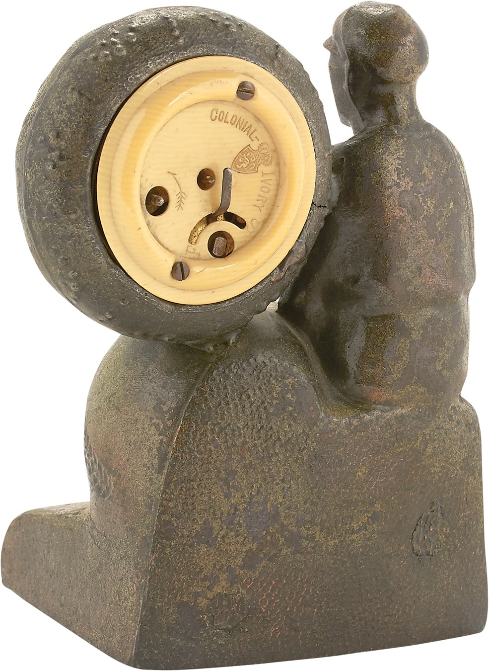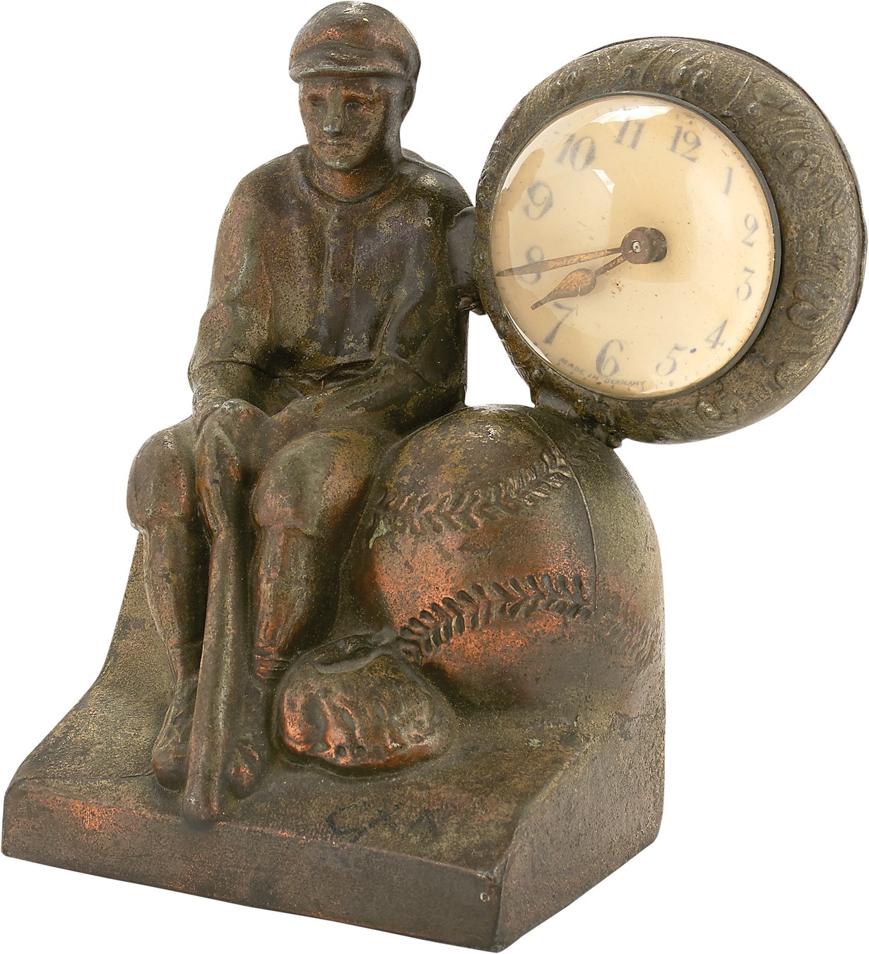 Stately and solid, this rare table clock depicts a baseball player with bat in hand while sitting on a bench with a catcher's mitt at his feet. To his side is a large baseball and clock. The figure measures roughly 4" wide and just under 7" tall. It is made of metal that features a fine patina, and the hallmarks from the maker are stamped on the back. The artifact is in EX condition although the clock does not work and is missing the winding knob.
