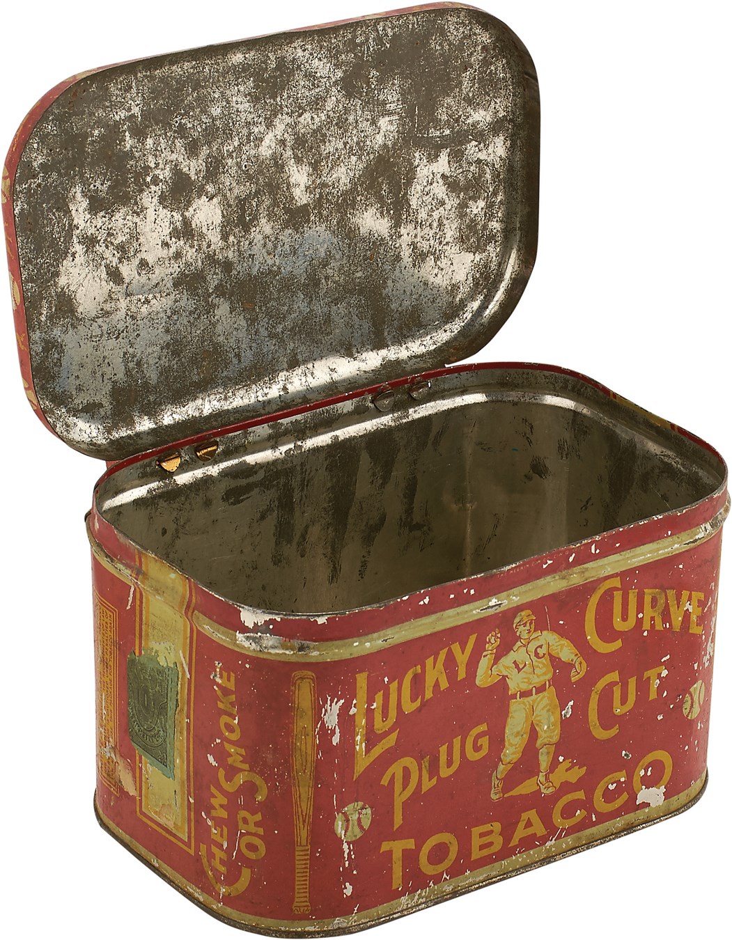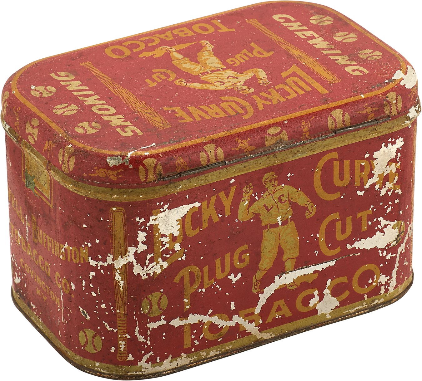 For better or worse, baseball and tobacco have had a longstanding relationship, and this vintage artifact from a century ago is a prime example" a 6.5"-wide tin for Lucky Curve Plug Cut Tobacco that is adorned with baseball references, including a player on the top of the lid and on both sides. There are also bats and baseballs all over the tin, which boasts very nice colors, There are some abrasions but the colored lithography is sill 90+ percent intact. One side of the tin looks better than the other and makes for a wonderful display.