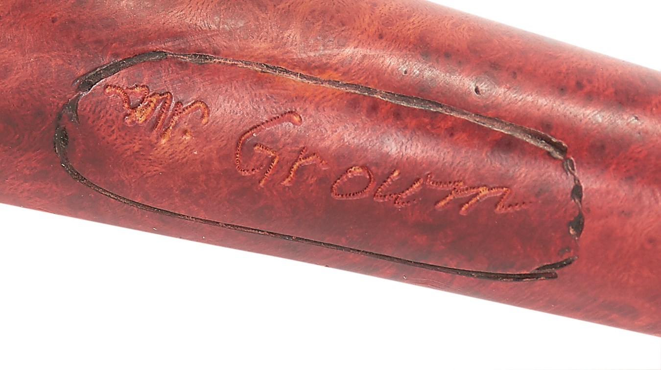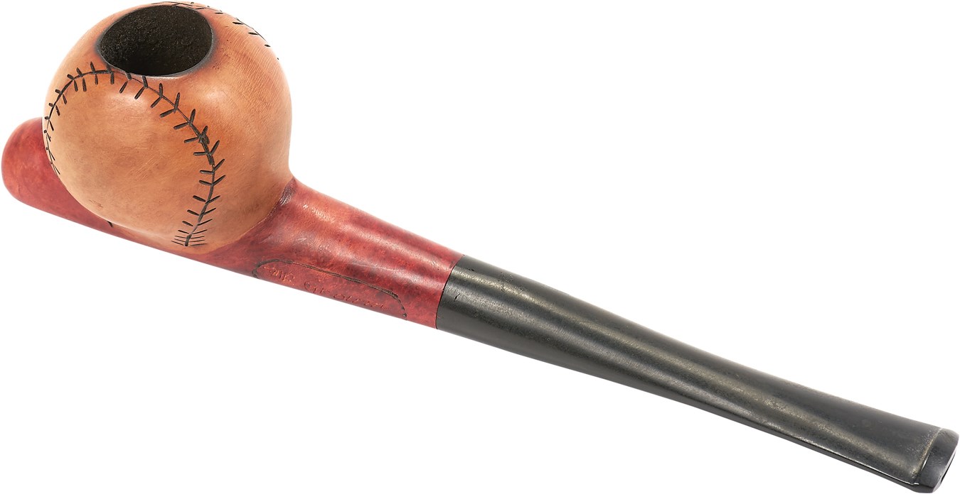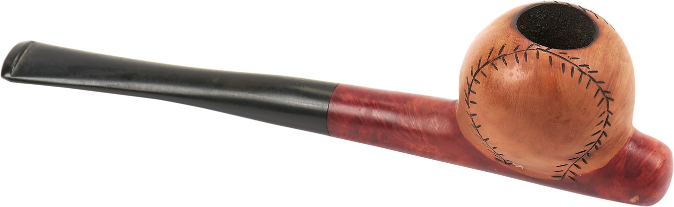 That ball was smoked! From a century ago, this pipe features a bowl is in the shape of a baseball complete with seams, while the end of the pipe is also shaped like a bat, giving it a national pastime air. Signed by the artist, it is in NRMT condition.