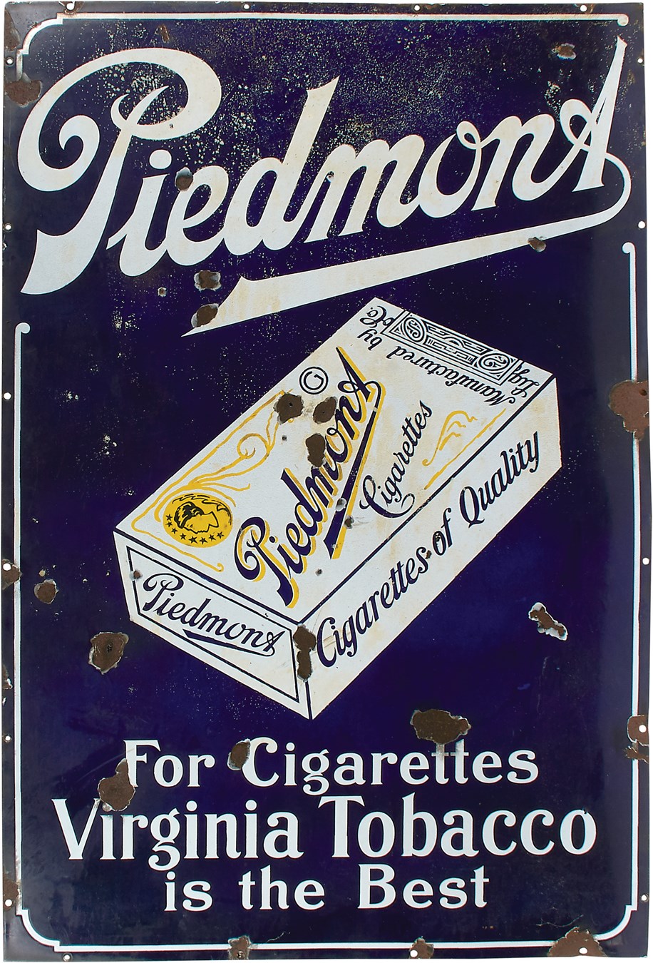 Porcelain on metal, this large sign measures a substantial 30x46" and dates from the same time period as the T206 baseball cards. The colors are blue, white, and yellow, and Piedmont Cigarettes are the subject, with message stating, "“For cigarettes Virginia Tobacco is the best.” An image of a pack of the smokes is in the center, and though there are numerous chips out of the porcelain, this still makes for a wonderful display.