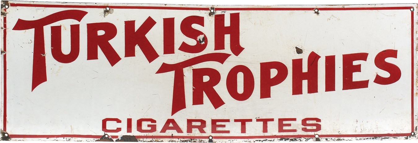 This vintage sign originates from the same time period that the T3 baseball cards were produced, in the early 1910s. The 36x12" metal sign has "Turkish Trophies Cigarettes" on the front in red porcelain surrounded by white background. It shows wear consistent with use and its age, but retains its classic feel and rates in Very Good condition.