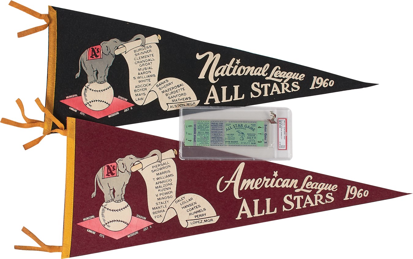 The first of two All-Star games to be played in 1960 was held in Kansas City, and this quality quartet pays great tribute to that Midsummer Classic. First is an encapsulated full, unused ticket to the game, graded Good by PSA due to a crease in the center, otherwise it would be graded much higher as it presents beautifully. There are two felt pennants, one for each team, American and National, with both bearing the names of the starting players on them. Last but far from least, a NRMT press pin from the game featuring the classic A's Elephant has a threaded post on the back, but is missing the nut. The game was held in Municipal Stadium, and the NL prevailed over the Junior Circuit in a 5-3 decision.