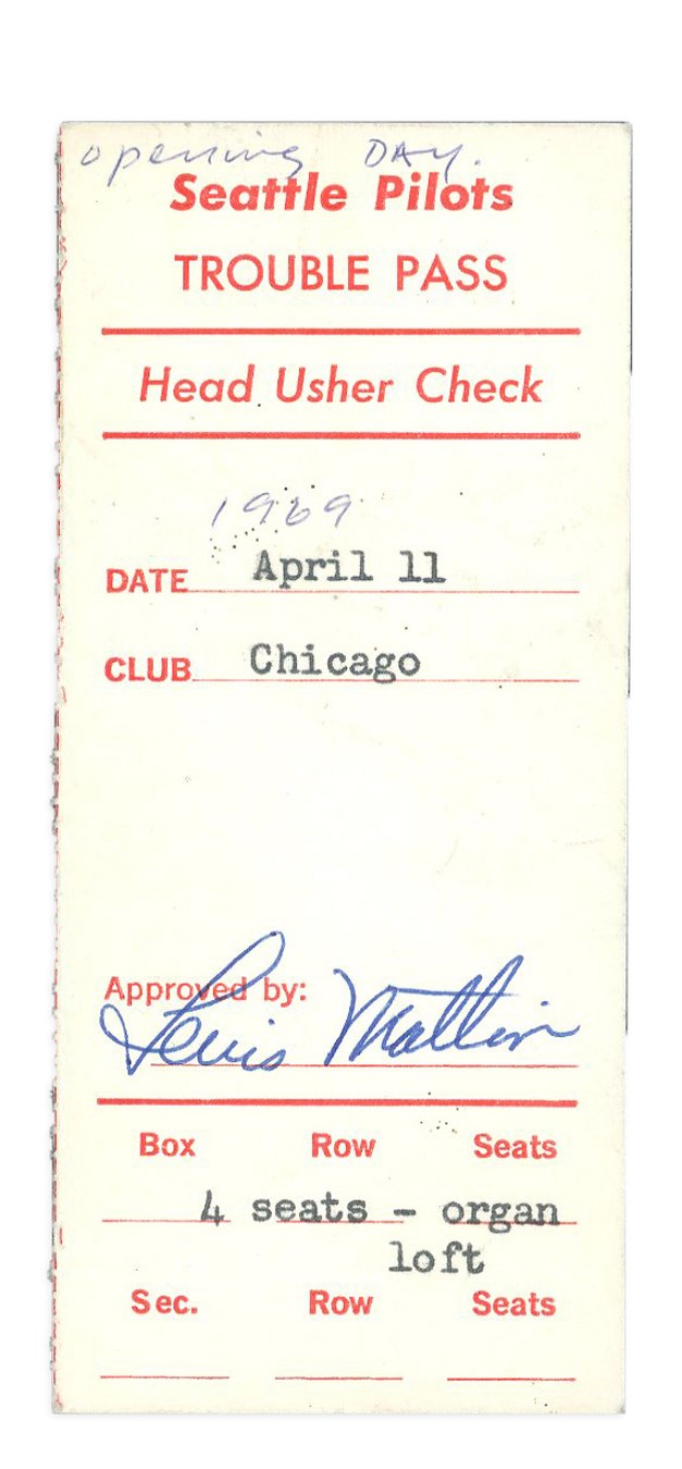 1969 was a landmark year as man walked on the moon, music history was made at Woodstock and the expansion Seattle Pilots enjoyed their only year of existence before moving to Milwaukee and becoming the Brewers. From that fateful season comes this exceptionally rare Opening Day "Trouble Pass" and official game program. The pass features pencil and print, and is signed by the man from whom this collection emanates: team executive Lewis Matlin. The program is partially scored but is definitely from the game: a 7-0 win against the White Sox in the home opener. There are a couple of creases and some writing on the back but is otherwise in EX+ condition. The Pilots went 64-98 in their only season in the Emerald City. Seven years after their departure, another expansion team - the Mariners - filled the baseball void in the Pacific Northwest.