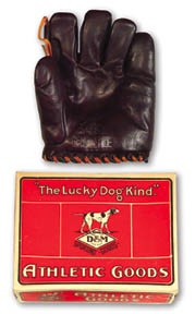 Now we know why they call it "dead stock." This glove is so lovely, it could stop your heart. Gorgeous horse hide glove is perfect. We'll just leave it at that. No other word could describe the supple softness, the absolute absence of anything that would suggest it's over three-quarters of a century old. Rare black color, with Mint stamping. It has obviously spent its entire life in the box, which has only slight denting and a small tear (both of which likely happened back in the Twenties) to discourage a perfect rating itself. Even the original mini-booklet, entitled "How to Play the Outfield and How to Steal Bases, by Max Carey" is here. What time machine did this come from?