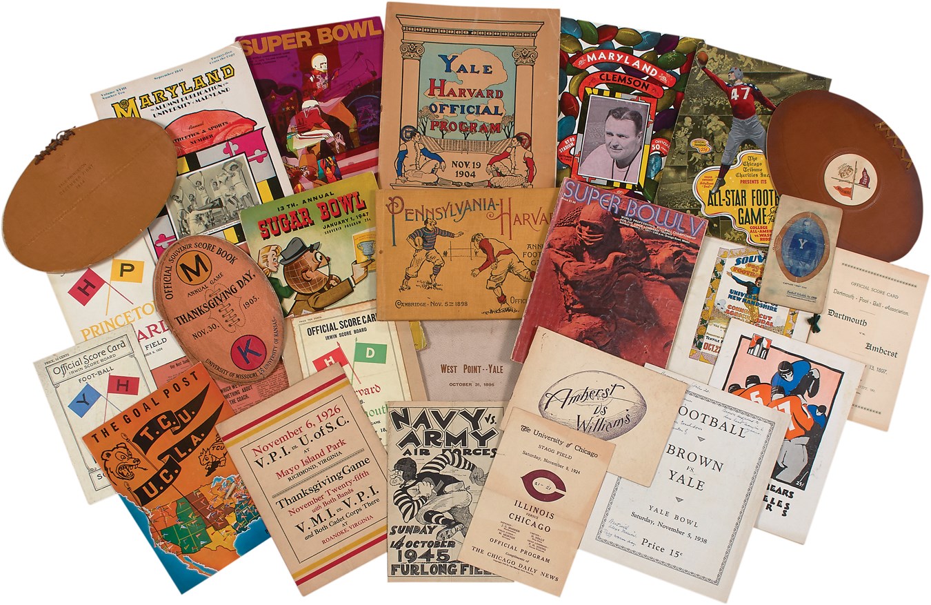 Culled over decades from a hobby old timer, this superb collection of 26 publications spans the generations, with condition averaging EX: 1) 1926 Yale vs. Harvard program. 2) 1924 Princeton vs. Harvard program. 3) 1921 Green Bay Packers program. 4) 1894 Yale vs. Princeton football-shaped program. 5) 1970 Super Bowl Program Tulane Stadium. 6) 1947 Maryland. 7) UCLA vs. TCU program. 8) 1905 Missouri vs. Kansas football-shaped program. 9) 1947 Sugar Bowl program (GA vs. NC). 10) 1926 VPI vs. USC (Thanksgiving game). 11) 1911 Harvard vs Dartmoth. 12) 1945 Army-Navy handout. 13) 1952 Maryland vs. Clemson. 14) 1896 West Point vs. Yale program. 15) 1904 Yale vs. Harvard program. 16) 1938 5th Annual All-Star Game Program (College All Americans vs. Washington Redskins). 17) 1898 Pennsylvania vs, Harvard program. 18) 1909 Yale Football schedule. 19) Harvard vs. Princeton football-shaped dinner menu program. 20) 1897 Dartmouth vs. Amherst.  21) 1927 NH vs. CT. 22) 1924 Illinois vs. Chicago program. 23) 1904 Amherst vs. Williams. 24) 1938 Brown vs. Yale at Yale Bowl Program. 25) 1926 Chicago Bears vs. LA Tigers. 26) 1971 Dallas vs. Baltimore Super Bowl program.