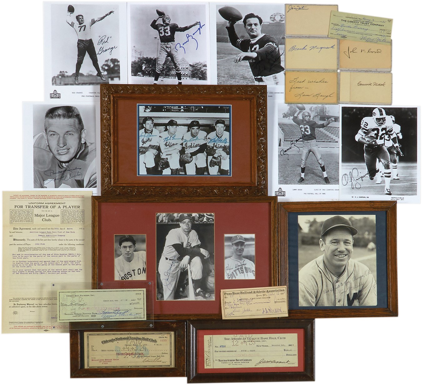 Some GREAT stuff from various sports. FOOTBALL: Vintage signed 3x5’s: Jim Tatum (CFHOF), Johnny Blood, Nagurski and two Sammy Baugh plus FDC. 100 Sammy Baugh signed 8x10s (3 poses). HOF signed publicity photos: Grange, Baugh, Luckman, Unitas, OJ. BASEBALL: 1892 “Pana Base Ball” signed check.  John Pieh 1916 NY Yankees Transfer signed Ruppert & Brice (NM). Wynn, Lemon, Garcia, Feller 8x10". Three DiMaggio brothers signed photos. LETTERHEAD: Mostly 19th century/early 20th sports letterhead and envelopes: Wright & Dotson, Spalding, Lone Jack Tobacco (15). FB & BB SIGNED CHECKS: 1960 Vince Lombardi Green Bay Packers Signed Payroll Check. 1955 Lefty Grove Check. 1924 Chicago Cubs payroll check signed William Veeck, Sr. 1925 NY Yankees check signed by Ruppert & Barrow. Some extras.
