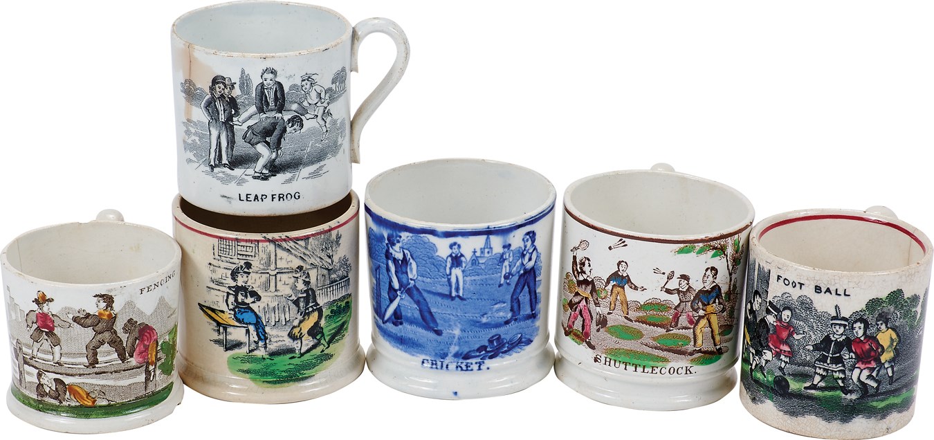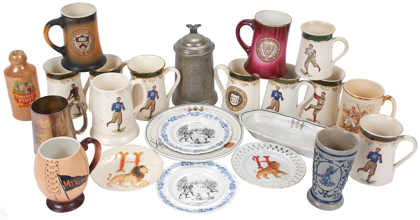 Wonderful collection of vintage porcelain. MUGS: 1-11) Series of the circa 1907 Earl Christy footballers and one baseballer. Mostly Princeton, plus Yale, Columbia and Harvard, one baseball and others football, total of 11 pieces. 12) 1930s baseball from England is scarce and the highest quality. 13) Turn of the century Mettlach cricketer. 14-15) Two engraved pewter steins: 1886 “First Fours” with glass bottom and 1905 for “150 yards” engraved. 16) Beautiful figural football-shaped “Mount Vernon.” PLATES: 17-18) Two handpainted Havana Lions Cuban baseball. 19-20) Pair of French "Les Sports" football plates. 21-23) Trio of baseball team heavy china dinnerware by Beamish Glassware. One with team "S" and two "P” (Pittsburgh?). Two plates and veggie tray. 24) Early soccer “Stout” ceramic beer bottle by Battey with original paper label. 25-30) Collection of mid-19th century cups made of early "paste," a rare form of ancient china. All are sports with shuttlecock, cricket (2), fencing, "foot-ball" and earliest form of boys playing a form of baseball (ball but no bat). Overall in EX-MT condition.