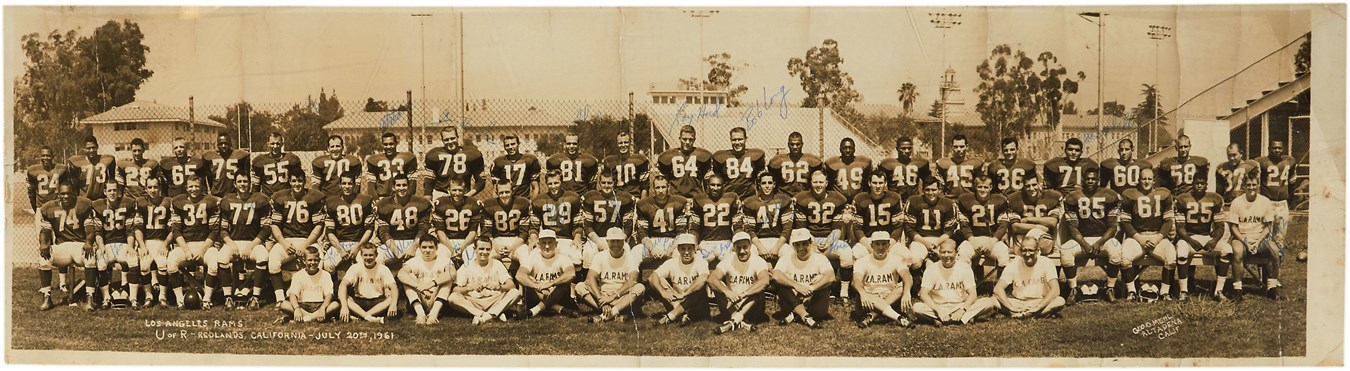 The 1961 Los Angeles Rams only sported a 4-10 season, but their team included a number of stars and future Hall of Famers pictured on this spectacular 8x29.5" original panoramic photo by photographer George Mehl. Making this all the more rare is that it is signed by a number of significant players including: Crazylegs Hirsch, Jon Arnett, Jack Pardee, Dick Bass, Carroll Dale, Bob Long, Jim Boeke and others. The photograph is bold and clear and clean. It has multiple creasing. Extremely rare. LOAs from PSA/DNA and JSA.