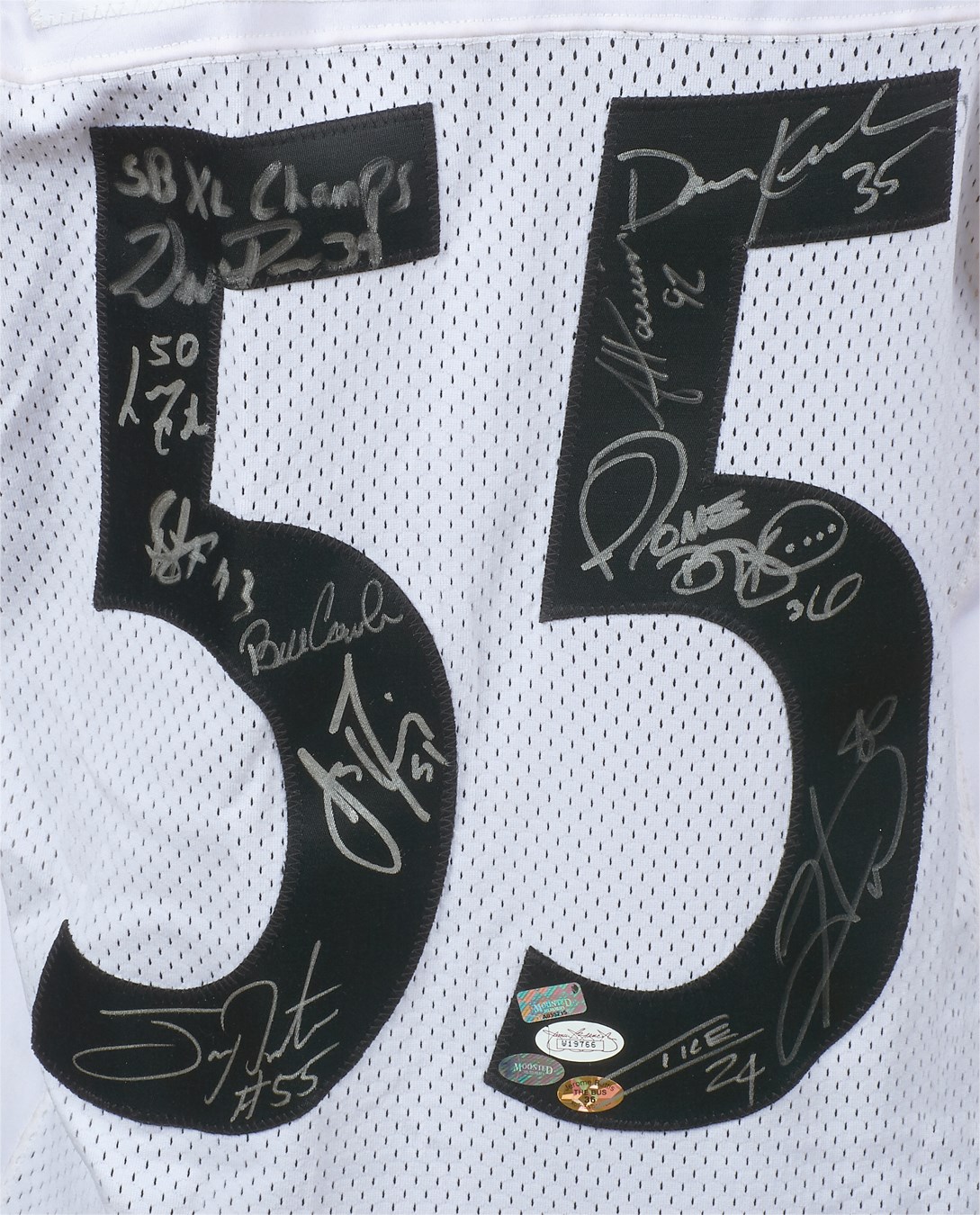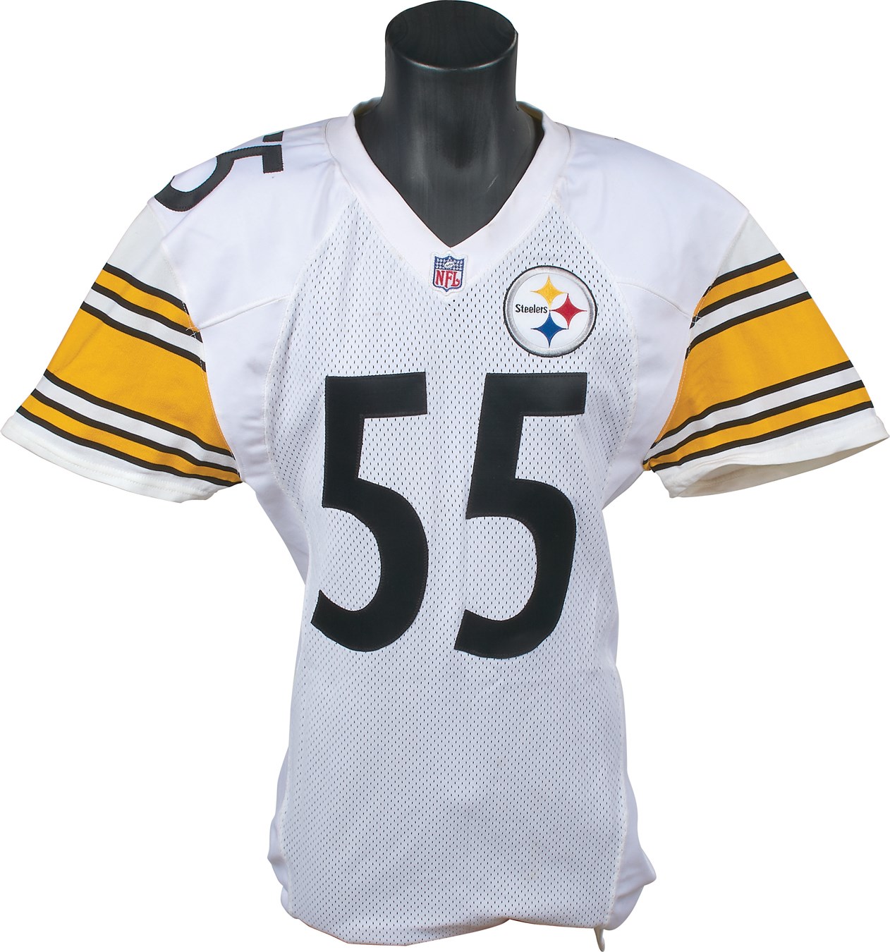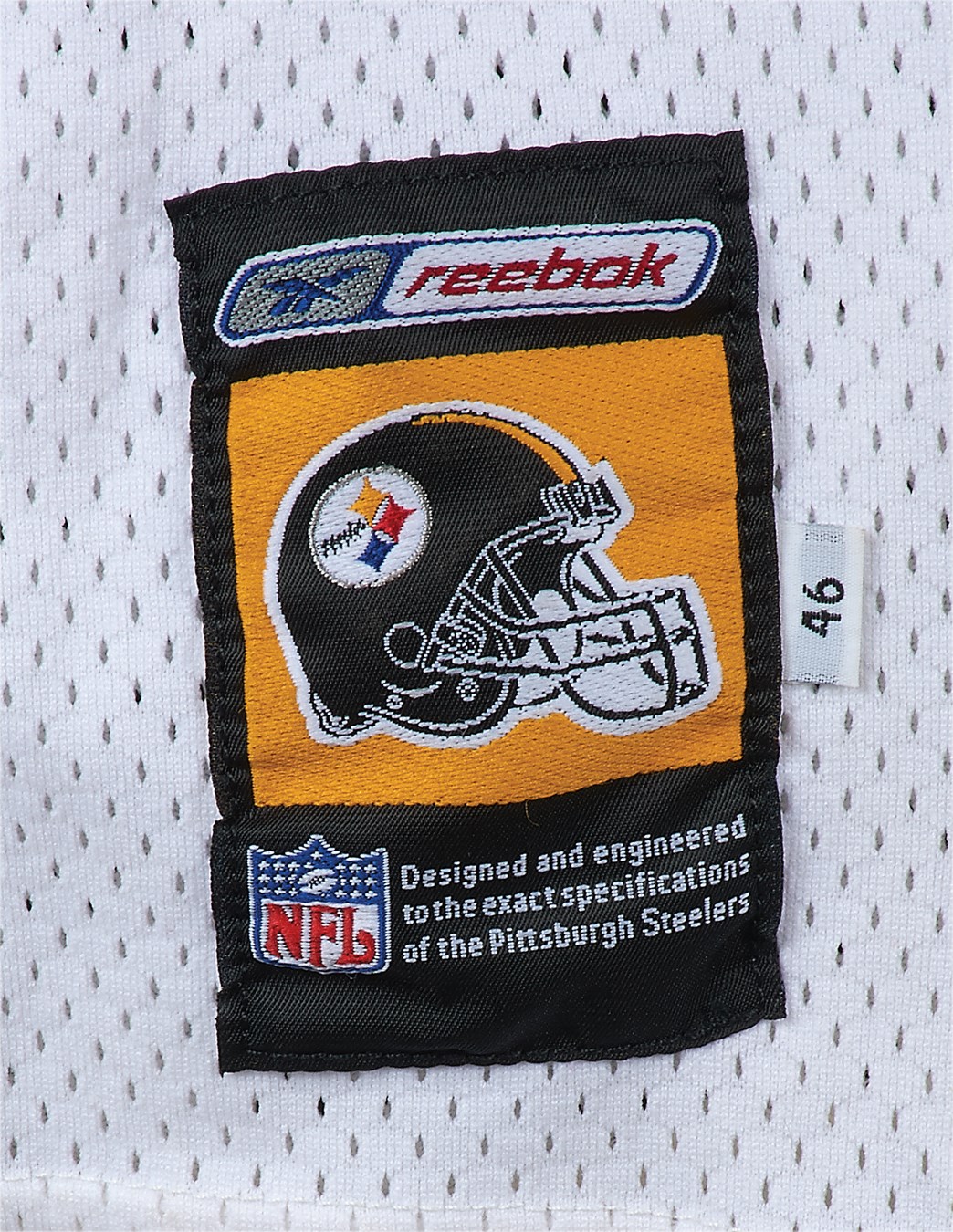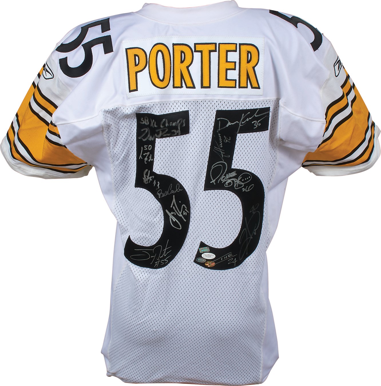 This white Pittsburgh Steelers jersey shows light use from standout linebacker Joey Porter. It bears his number "55" on the front, back and both shoulders, with collar tag indicating "01-46" (year and size) and Reebok size 46 tagging on the front. Interestingly, it is signed on the back numbers in silver Sharpie by 11 members of the 2006 team, which won Super Bowl XL that season over the Seattle Seahawks. Porter played for both 2001 and 2006 teams, and "Super Bowl XL Champs is written above the autographs. Signatures include Bettis, Porter, Holmes, Kreider, and more. JSA authenticated.