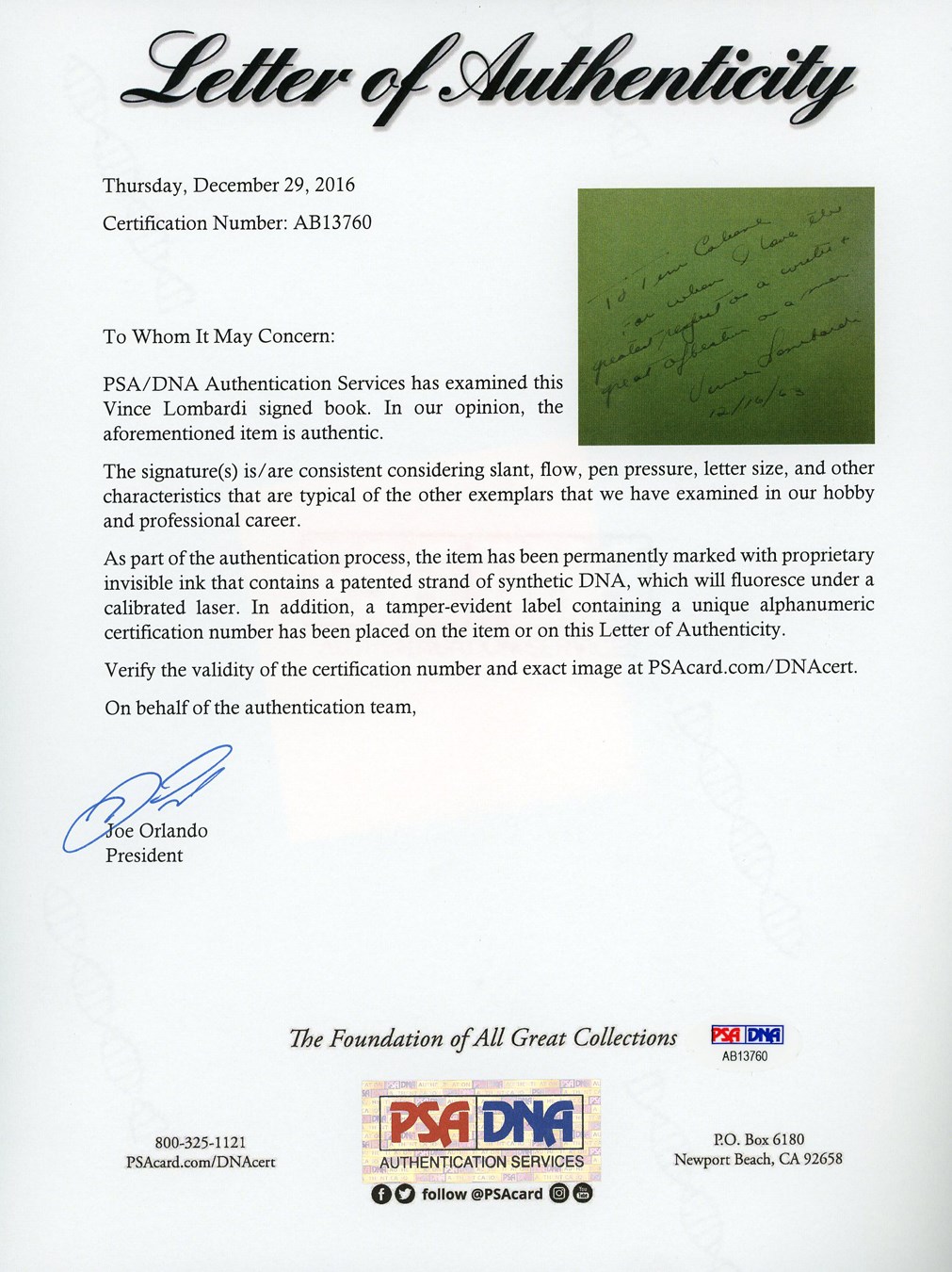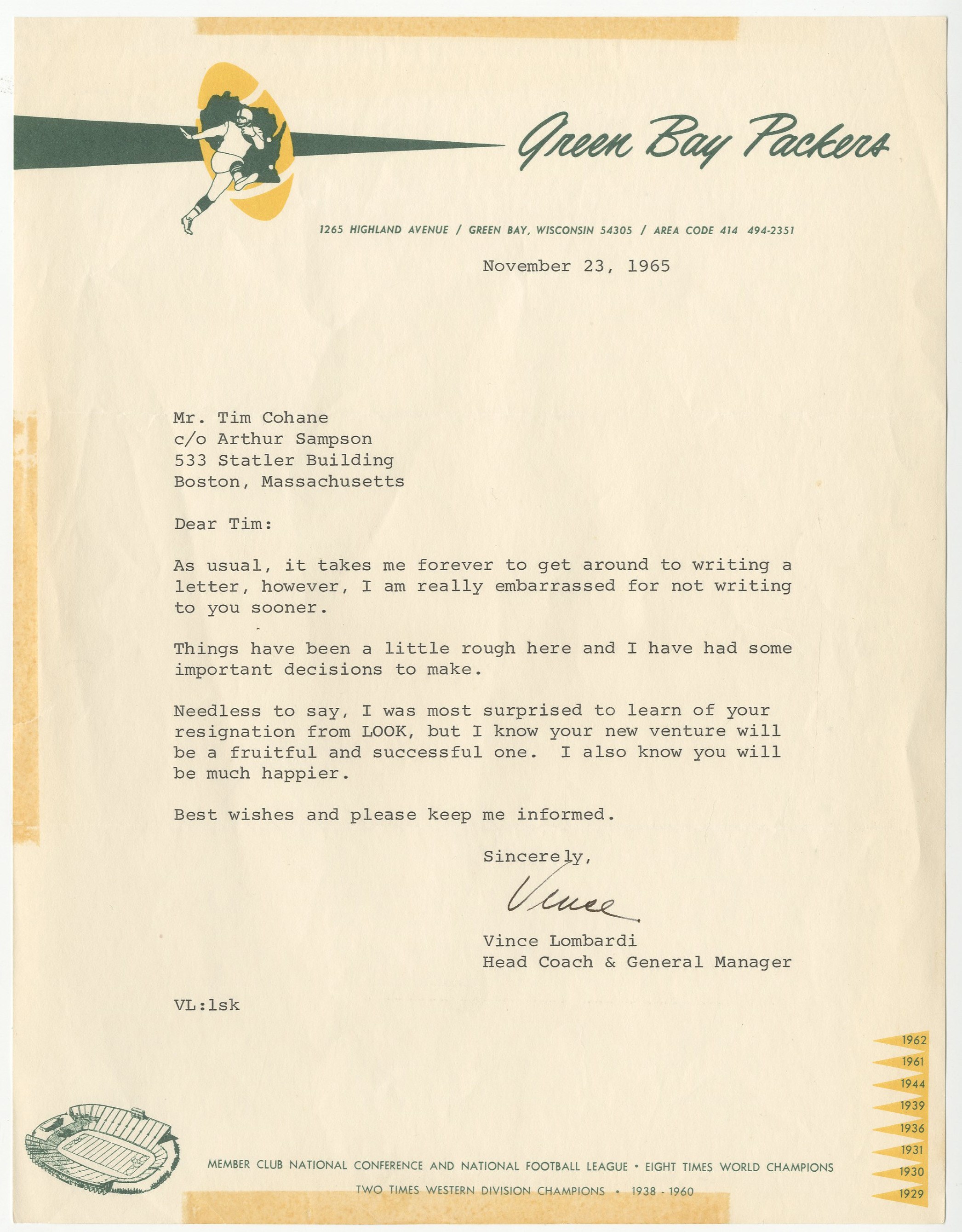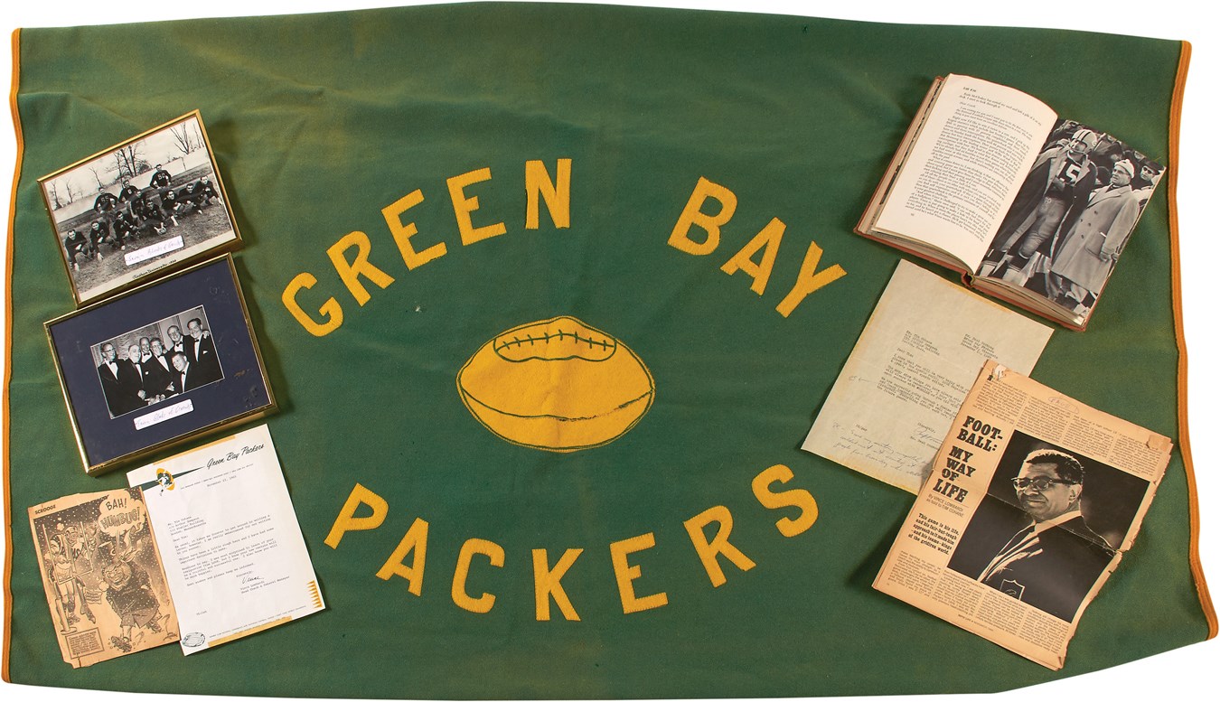 Long-time sports editor of LOOK magazine Tim Cohane was also a friend of coaching legend Vince Lombardi, and this lot attests to that friendship. Featured is a beautiful 57x63" green and yellow Bertrand's blanket with Cohane's name embroidered on a yellow patch, gifted after one of Lombardi's many championship seasons. Also included is a signed and personalized copy of Lombardi's book (PSA authenticated), Run to Daylight, dated 12/16/63; a scrapbook that includes a 1965 personal letter from the coach on Packers' stationery; and a pair of framed photos featuring the Fordham University "Seven Blocks of Granite," a phrase coined by Cohane regarding the Rams' offensive line of the 1930s, which included Lombardi.