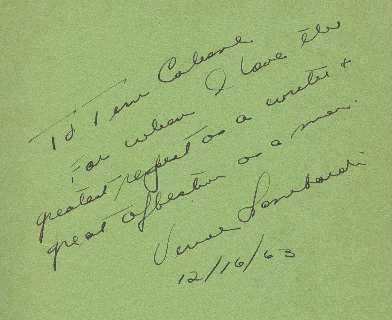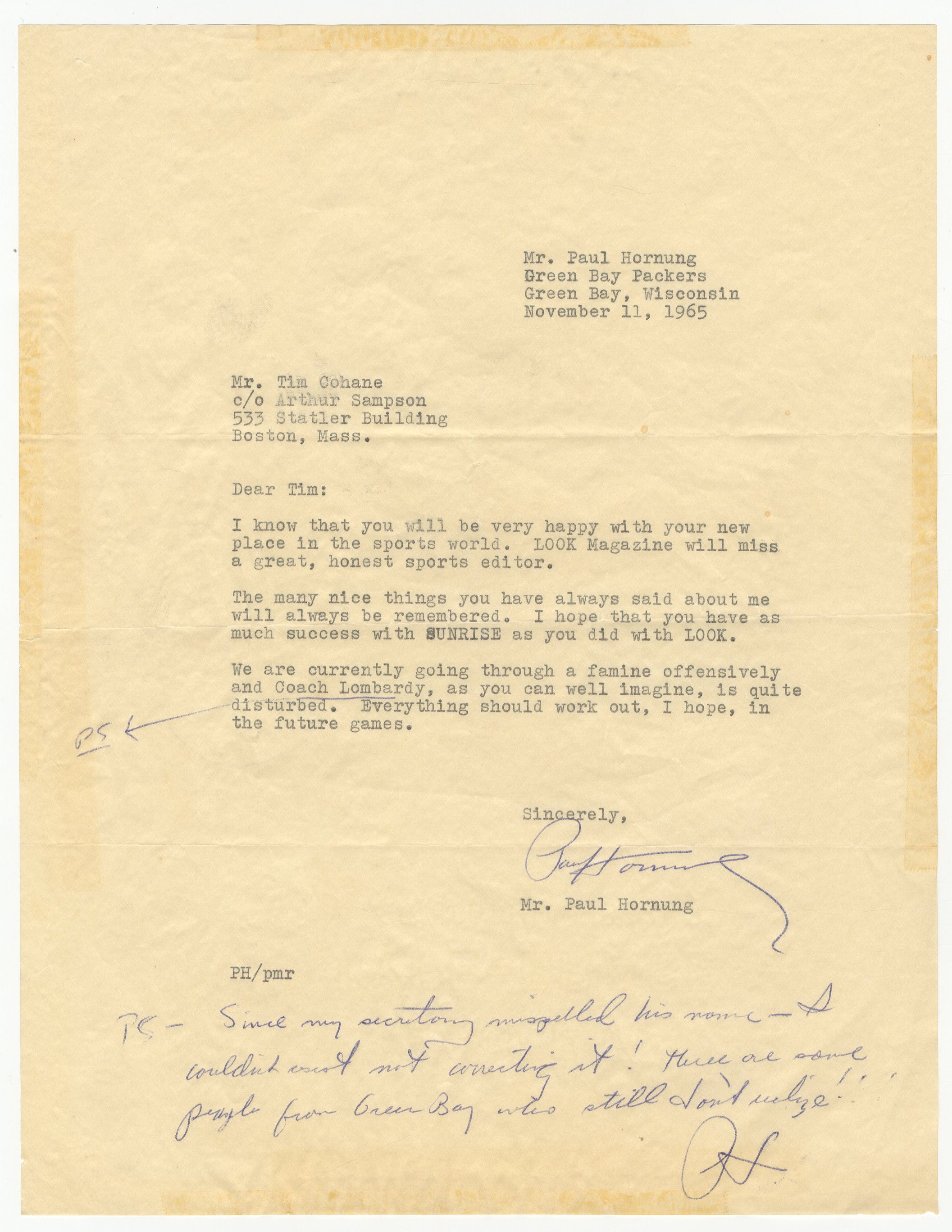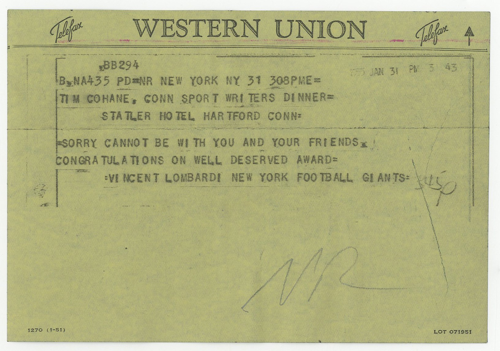 Long-time sports editor of LOOK magazine Tim Cohane was also a friend of coaching legend Vince Lombardi, and this lot attests to that friendship. Featured is a beautiful 57x63" green and yellow Bertrand's blanket with Cohane's name embroidered on a yellow patch, gifted after one of Lombardi's many championship seasons. Also included is a signed and personalized copy of Lombardi's book (PSA authenticated), Run to Daylight, dated 12/16/63; a scrapbook that includes a 1965 personal letter from the coach on Packers' stationery; and a pair of framed photos featuring the Fordham University "Seven Blocks of Granite," a phrase coined by Cohane regarding the Rams' offensive line of the 1930s, which included Lombardi.