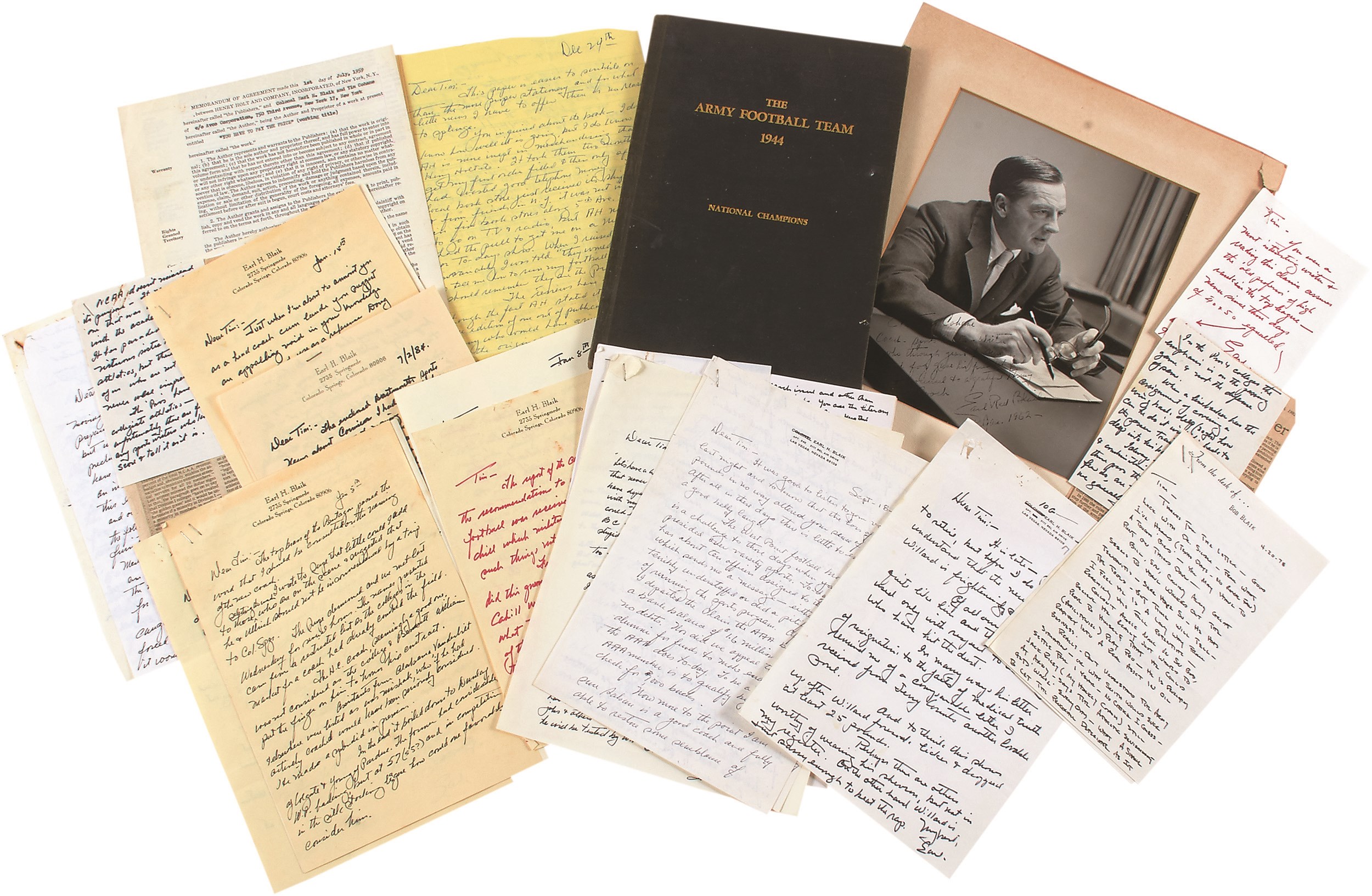 On, Brave Old Army Team - and march into some great Cadets football history in this lot. Earl Blaik was the head coach of the Army football squad during its heyday that included three National Championships from 1944 to '46. Tim Cohane and Earl wrote a book together titled, "You Have to Pay the Price," and offered is a signed 1944 Army Football National Champions book and photo, inscribed to Tim, along with a signed contract from Earl and Tim for their book, 19 signed handwritten letters from Earl to Tim, and multiple articles that Tim wrote about Earl. Wonderful archival material covering West Point football at its finest.
