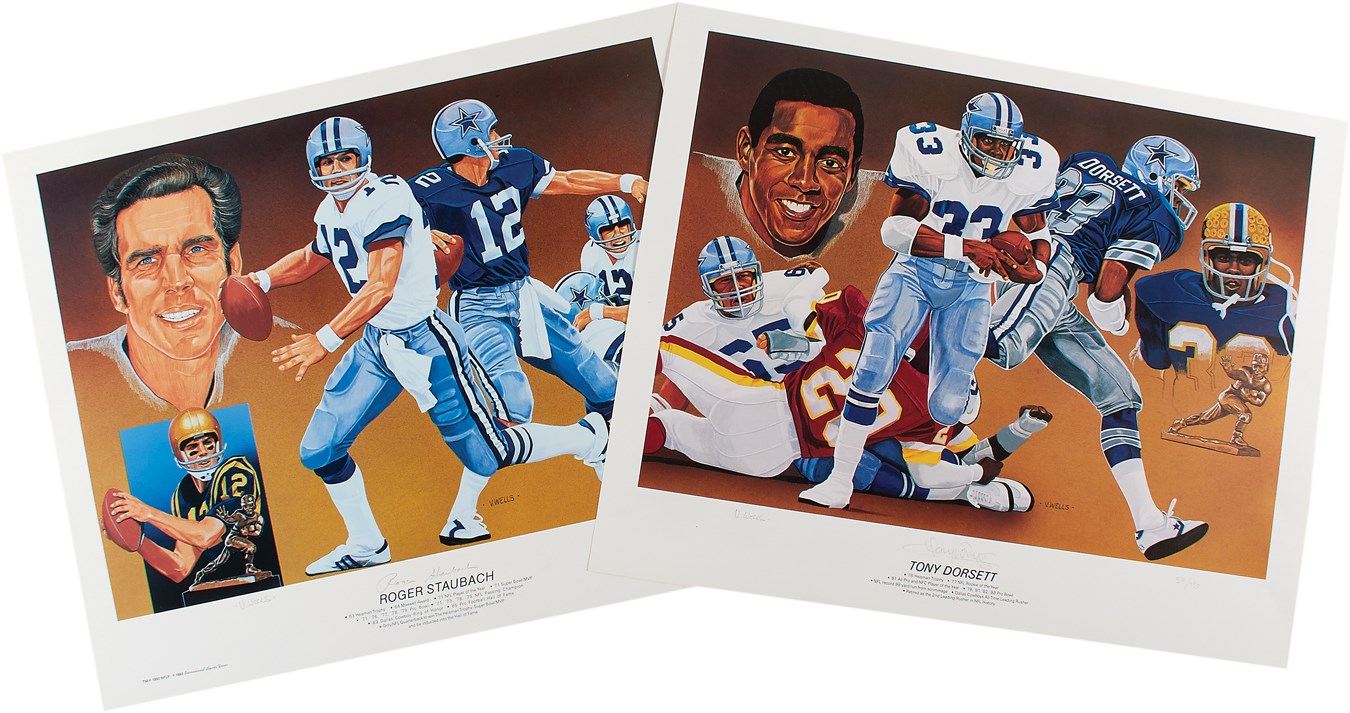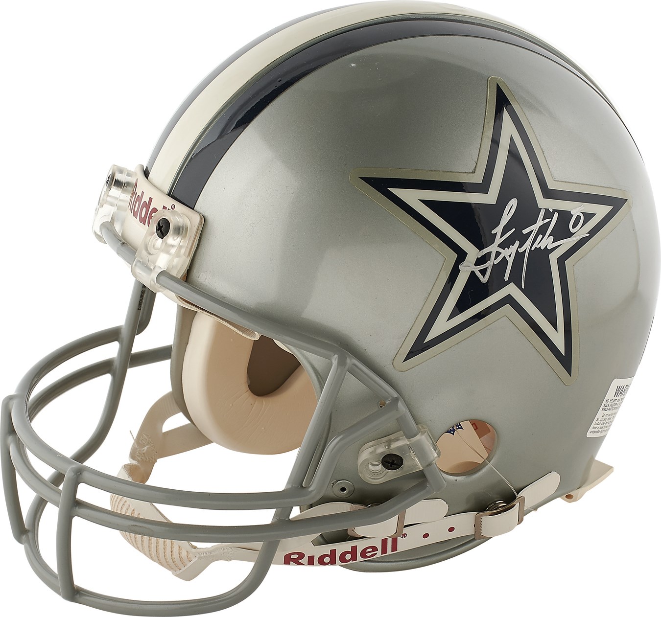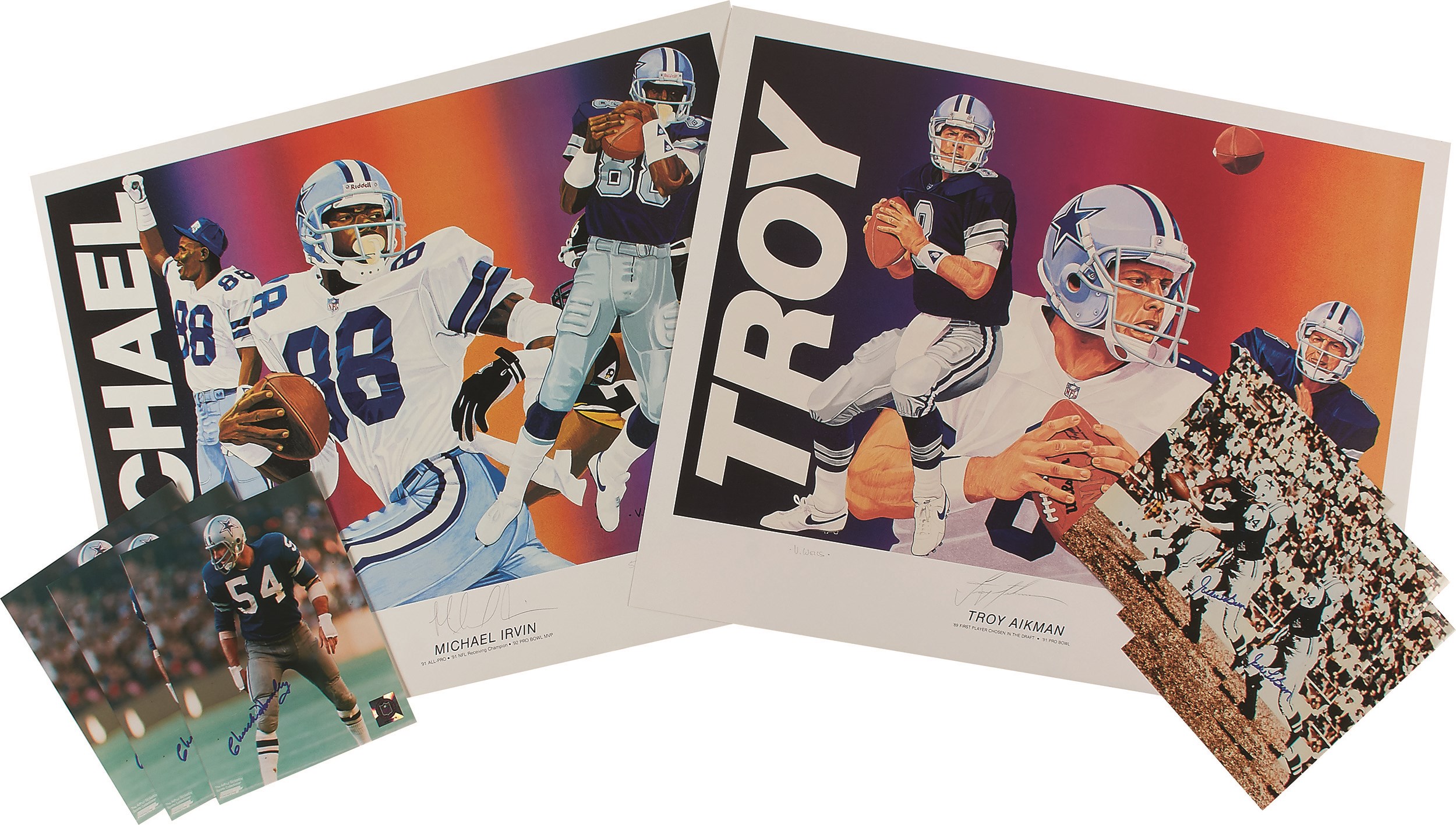 A great selection of over 25 autographs highlights this lot of Dallas Cowboys paraphernalia. The highlight is an unused Riddell Proline helmet with original hang tags, signed by Troy Aikman and Charles Haley, with each signing one of the iconic navy blue stars in silver Sharpie. Also included are colorful 25x22" signed Limited Edition lithographs of Roger Staubach, Aikman, Tony Dorsett, and Michael Irvin. Another unique addition is a signed and inscribed football from Troy Aikman to National Convention promoter Wanda Marcus. The inscription takes up the ENTIRE ball. Finally, a group of signed photos by Chuck Howley (11) and Eddie Lebaron (10). A half-century of greats are represented here, a must for fans of America's Team.