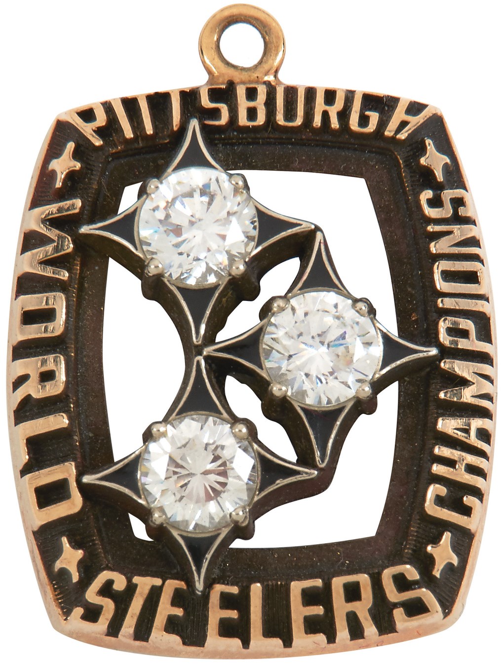 The Steel Curtain reigned supreme as the 1979 Pittsburgh Steelers captured their fourth Super Bowl title. This beautiful pendant, measuring just under 1x1", was given to players and team employees in the wake of the milestone. It is marked on the back with the distinctive Jostens logo as well as 10K, the face consists of four faux diamonds representing the team's titles to that point, and the bezel reads "Pittsburgh World Champions" along with the year. The Steelers defended their title of the previous season with a convincing 31-19 victory over the Los Angeles Rams in Super Bowl XIV.