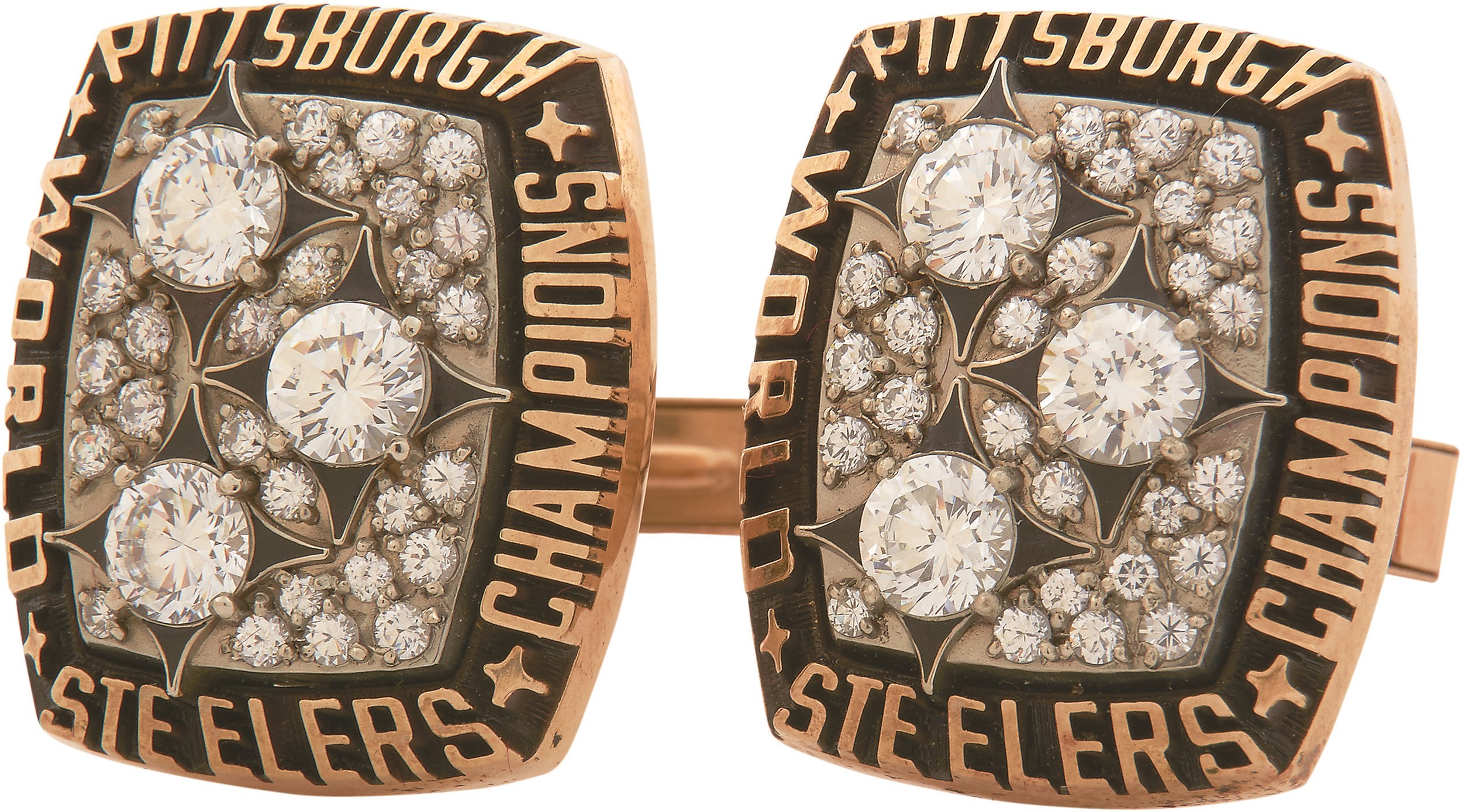 This gorgeous set of two cufflinks with original box was presented to players and team employees after the Pittsburgh Steelers' 1978 Super Bowl Championship. They bear the Jostens diamond "J" logo on the backs as well as 10K, and they are NRMT with faux diamonds, with three prominent stones in each indicating the team's three Super Bowl titles to that date. The Steelers topped the Dallas Cowboys by a 35-31 score as Pittsburgh became the first franchise to win three Super Bowls.