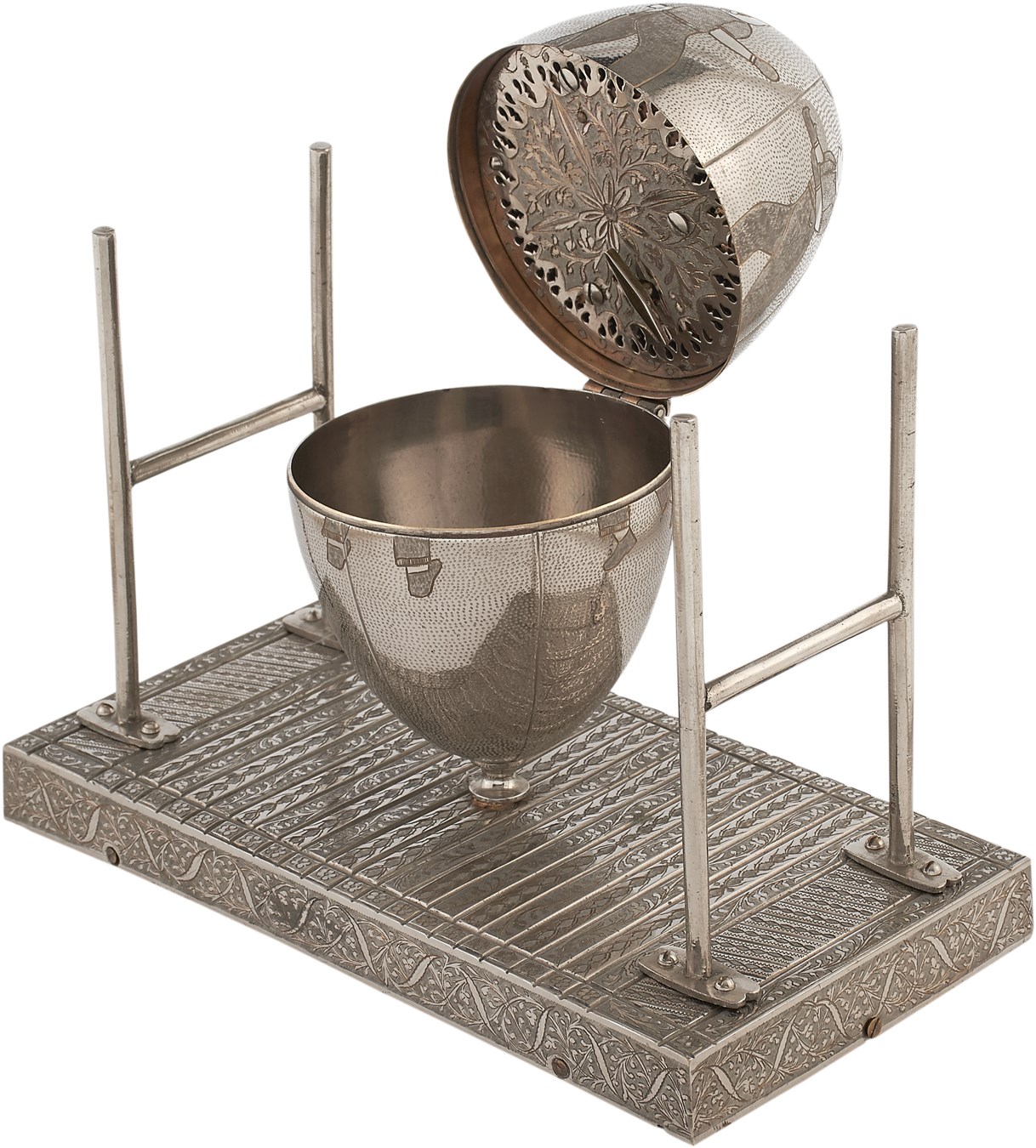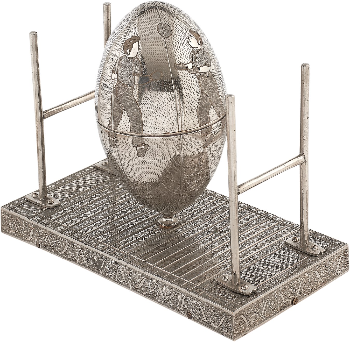 Designed in Victorian era fashion, this uniquely stunning and original work of art combines music and football in a clever way. The base is fashioned like a football field with goal posts at both ends, while in the center is a large football with actual music box contained within. The football features engraved game scenes and there is a great deal of decorative engraving on the artifact, lifting the creation far above the norm. And here's the "kicker": when the top of the football is opened, the music plays. The solid, stately music box is in EX condition and measures roughly 10x9".