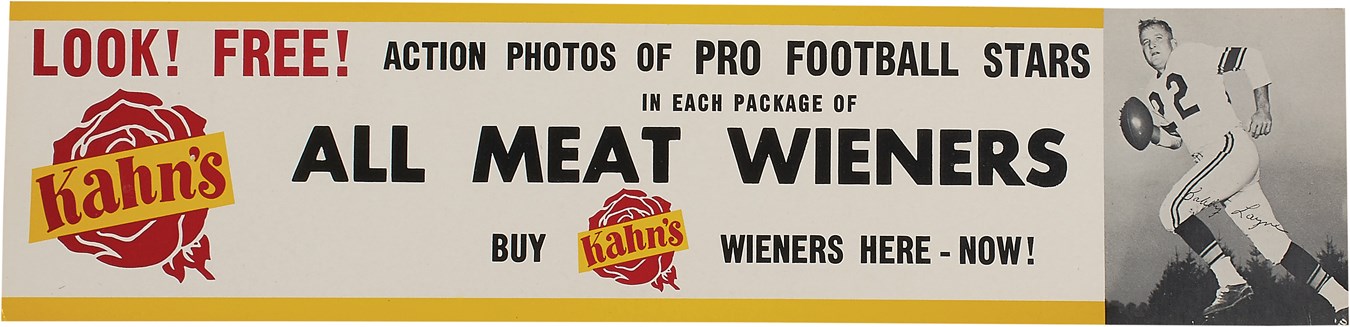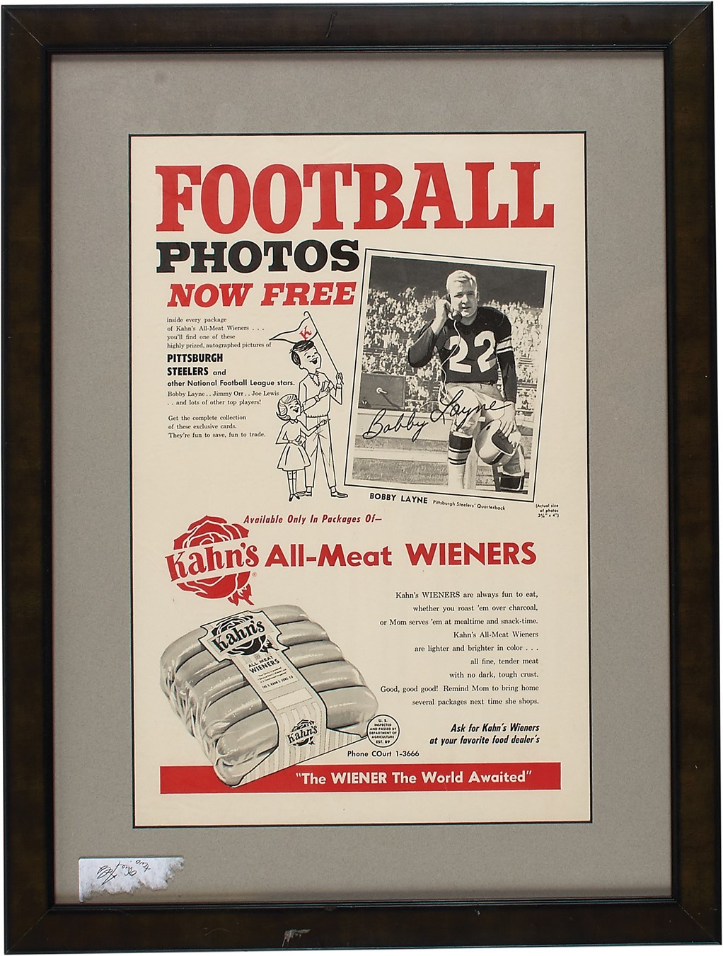 Rare and desirable pieces highlight these classic football card sets. 1) Gorgeous paper poster features Bobby Layne of the Pittsburgh Steelers promoting the highly desired 1962 Kahn's Weiners football card set. Nicely framed to 16.5x22", the poster itself is 11x16" and condition appears NRMT. 2) Great looking paper poster also features Bobby Layne. "Look! Free! Action Photos of Pro Football Stars In Each Package of All Meat Weiners." This one measures 15x3.5" and is in EX-MT condition. 3) This Photo Album is the book that you were to glue the crads into (for shame!), measuring 8.5x4" and also EX-MT.From the Gus LeDonne collection, legendary football and sports collector who passed away too soon in 2013. A top of the line buyer, Gus bought the best of the best in the early days of our hobby.