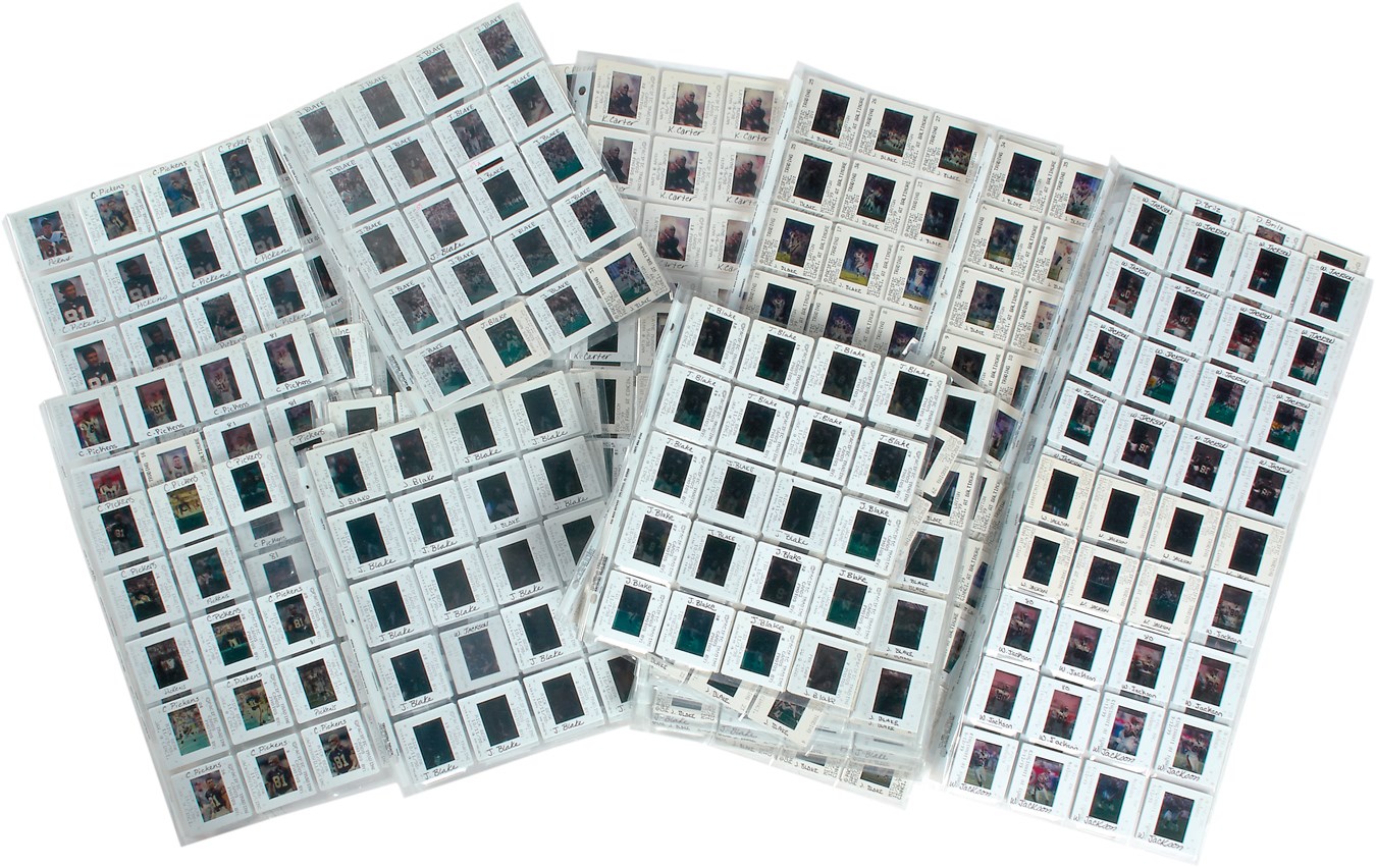 Get your fill of gridiron greatness with this amazing assortment of over 7,000 images from the 1990s. These are original negatives/transparencies that are Type I from-the-camera and several were used for the creation of football cards. Not only can beautiful prints of nearly any size be created from these originals, but one could spend hours just matching them to their respective football cards. The set features photography by Jack Wallin, Rob Leiter, Michael Cramer, John Cordes, Rick Berk, Tim Jackson, and Mitch Layton, and the players depicted include the likes of: Mills, Muhammad, Kragen, Miller, Garcia, Walls, Greene, Johnson, Kaysay, Hamilton, Hand, Burgess, Irving, Davis, Alexander, Feagles, Carter, Case, White, West, Coleman, Davis, Dodge and far too many more to list. The detail is splendid, as games, dates and players are written on the slides - tee up this lot and send a bid between the uprights.