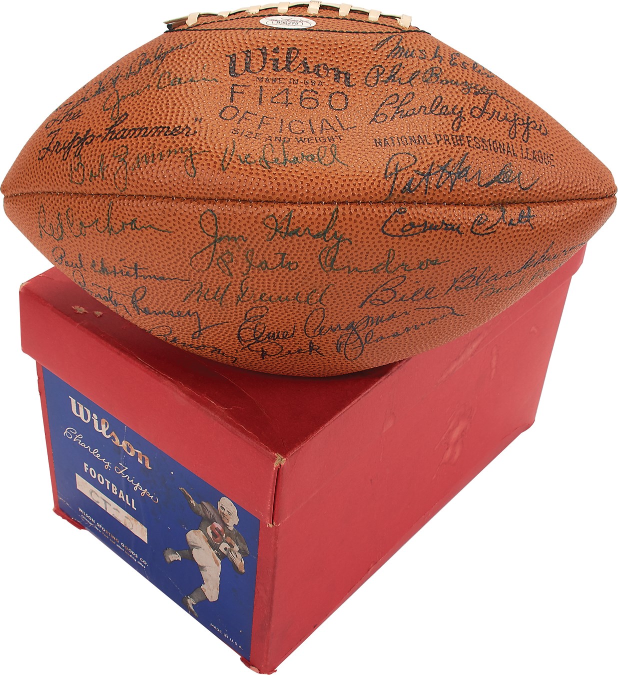 The ball itself is spectacular as are the autographs in this offering. It is a Charley Trippi brand ball with a marvelous picture box. Signatures and ball itself are NM+ and unimproveable. About 30 signatures: Charley Trippi, Paul Christman, Red Cochran, Buster Ramsey, Vince Banonis, Dick Plasman, Bud Perkins, Ham Nichols, Mush Esler (trainer), Phil B__, Plato Andros, Elmer Angsman, Chuck & Ray Apolskis, Bill Blackburn, Chet Bulger, Jim Cain, Bill Campbell, Corwin Clatt, Joe Coomer, Jerry Davis, Billy Dewell, Bob Dove, Bill Fischer, Pat Harder, Jim Hardy, George Petrovich, Bob Ravensberg, Vic Schwall, Clarence Self, Tom Wham, Vinnie Yablonski and Bob Zimny. Comes with JSA Authentication LOA. From the Gus LeDonne collection, legendary football and sports collector who passed away too soon in 2013. A top of the line buyer, Gus bought the best of the best in the early days of our hobby.