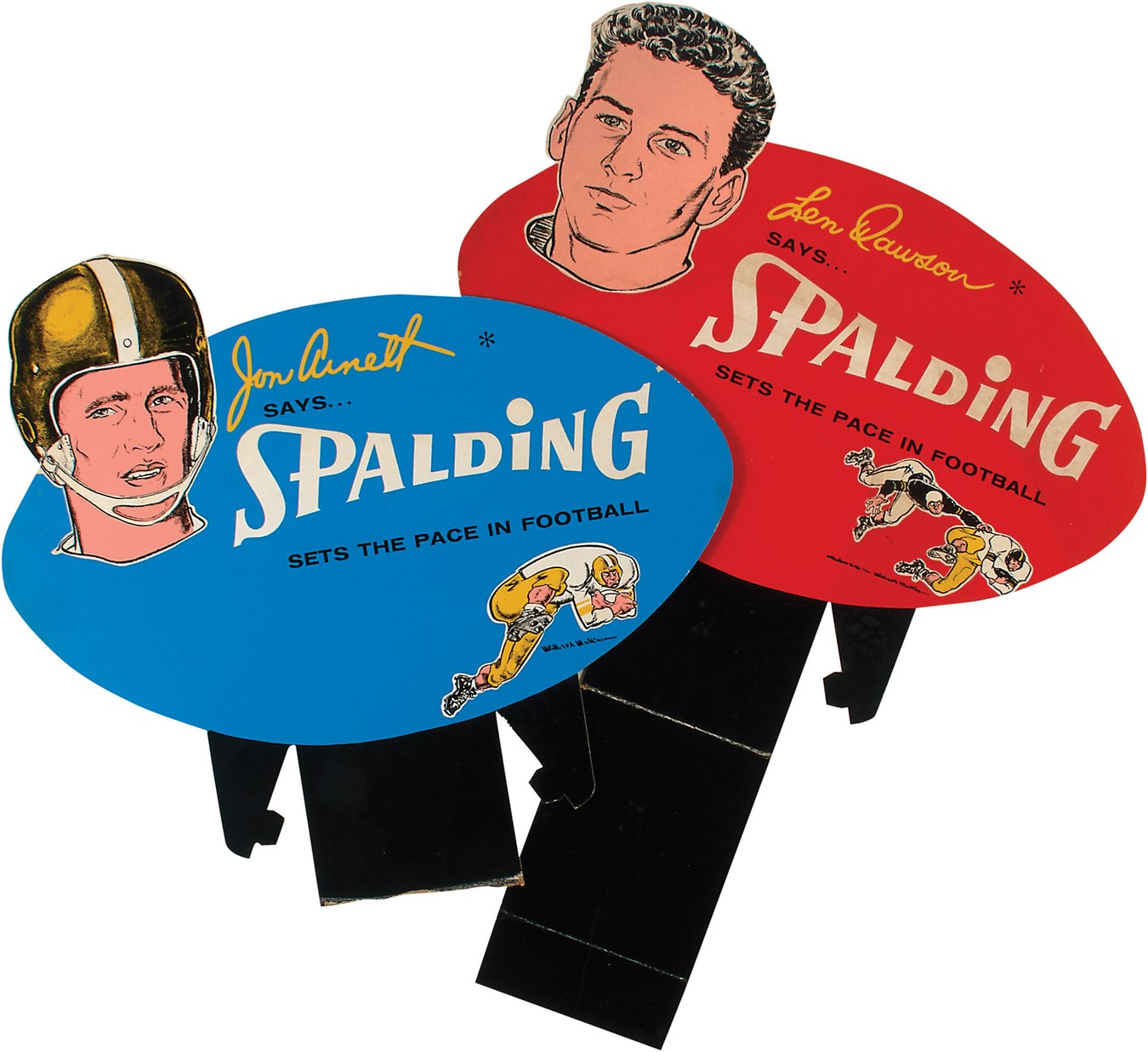 A spectacular matching pair in brilliant colors and condition, these were never used and both are from the same series in the early 1960s. These stunning countertop displays feature Len Dawson and Jon Arnett, and each tells you, "Spalding Sets the Pace in Football." Each measures 19x17". From the Gus LeDonne collection, legendary football and sports collector who passed away too soon in 2013. A top of the line buyer, Gus bought the best of the best in the early days of our hobby.