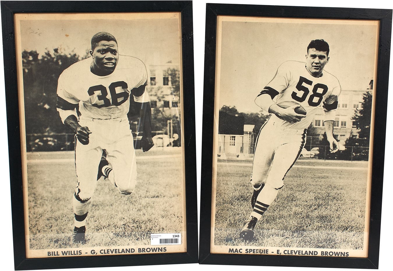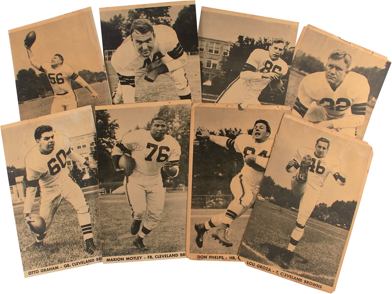 Cleveland sports fans will get a kick out of these rare football relics: Ten oversized photo cards that stand 21" tall and vary between 13" and 13.5" wide. The first of this kind we have ever seen, the premiums likely were issued as displays with the Carling Beer photos and feature 1950s players Otto Graham, Dub Jones, Lou Groza, Dante Lavelli, Don Phelps, Marion Motley, Lin Houston, Lou Rymkas, Mac Speedie and Bill Willis. The latter two player cards are framed. The average condition is EX with some wear around the edges and some tears and chunks missing from the bottoms.