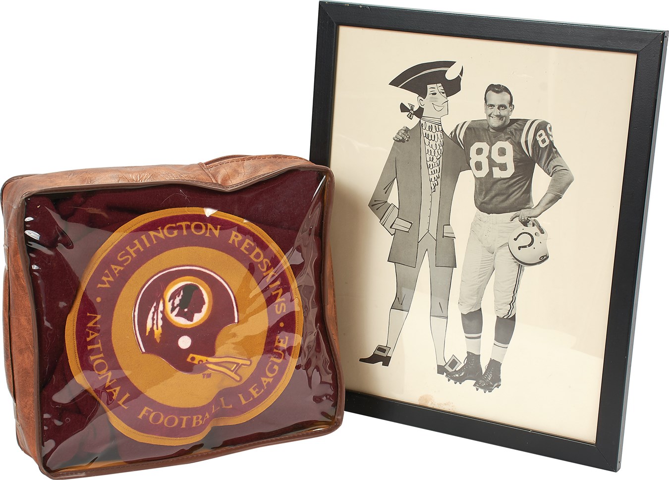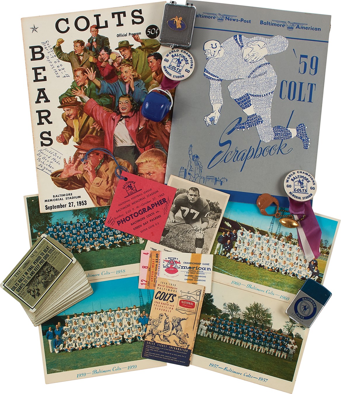 A fine collection, this assortment of Colts memorabilia came from an old time Baltimore area collector. In all, 18 pieces hearken back to the NFL powerhouse: 1) 18x15" framed ad of Gino Marchetti with illustrated pilgrim (perhaps a jab at the rival Redskins?). 2-6) 1957-60 Colts Christmas cards (5). 7) First game ever program. 8) Colts 1958 deck of playing cards in original box. 9-10) Two (2) World Champs pins with hanging pendants and mini-helmet. 11) 1962 press pin. 12) 1959 yearbook scrapbook, NM with newspaper inserts. 13) October 27, 1963, photographer press pass, Colts vs. Green Bay. 14) 1963 Colts Zippo. 15) 1960 Radio and TV schedule. 16) Dec 24, 1961, American League Champs ticket (SD Chargers Western Champs vs Eastern Champs). 17) 1963 Kahn's Weiner card of Dick Modzelewski. 18) And not to forget those rivals, a 1970s Washington Redskins Pendleton Stadium Blanket, unused MINT in original carrier with seat cushion. Highest quality, these cost $45 way back then!