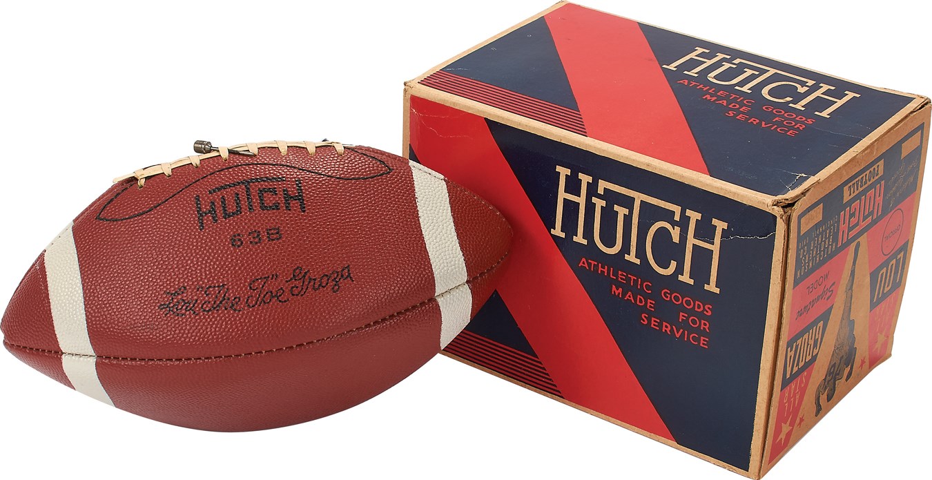 Extremely tough to find, this full-sized football comes in a beautifully illustrated picture box with image of Lou Groza, perhaps the finest pure kicker in NFL history. Box shows great graphics of superhuman kicker, nicknamed "The Toe" for his kicking prowess. The ball is in NRMT condition, box has some wear but label is nice.From the Gus LeDonne collection, legendary football and sports collector who passed away too soon in 2013. A top of the line buyer, Gus bought the best of the best in the early days of our hobby.