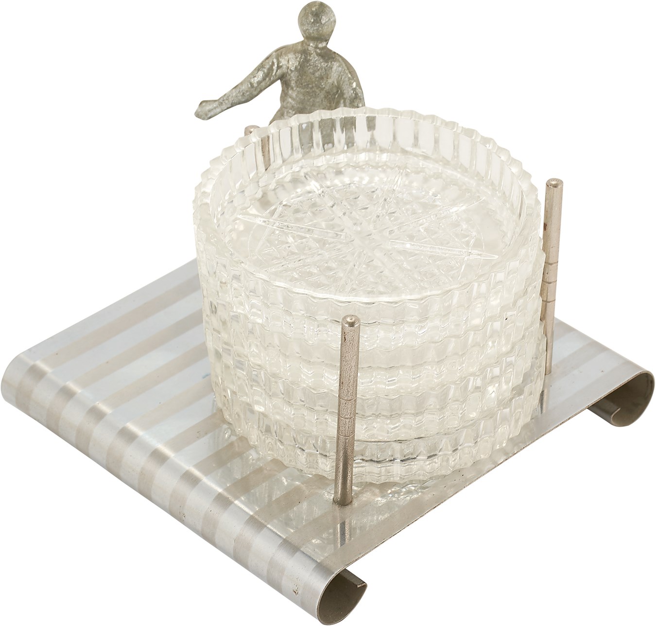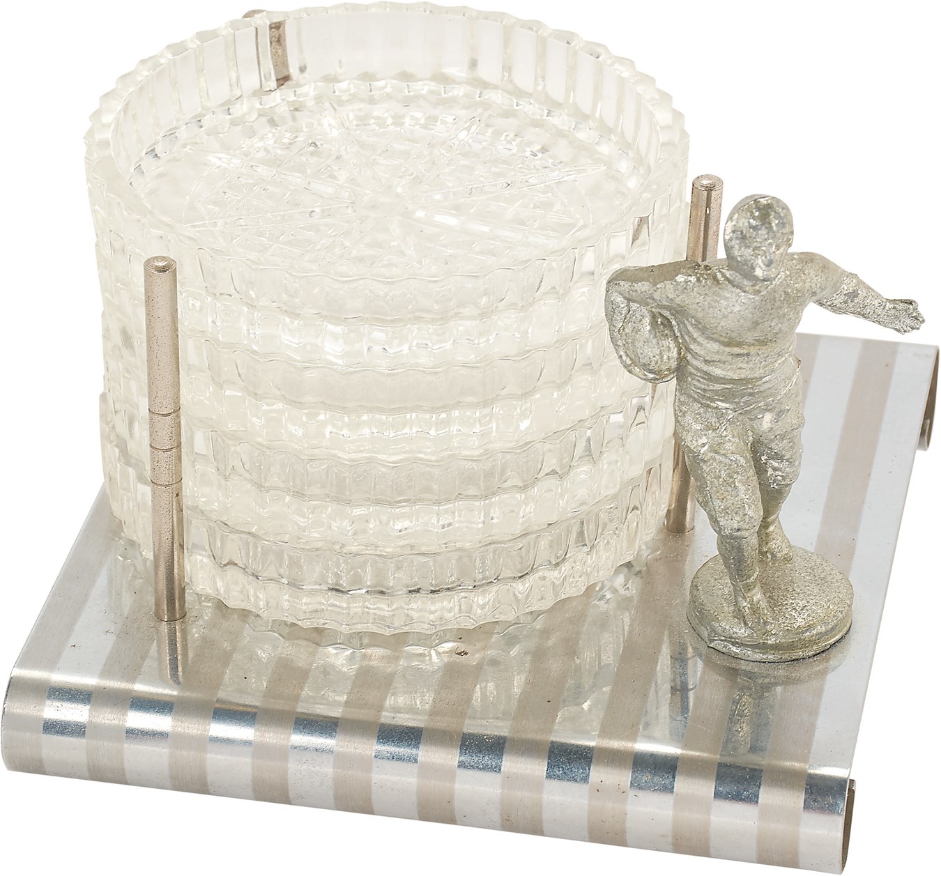 The drinks are on you with the right bid on this metal tray, which features a figural football player running with the ball. The tray - which measures 5x5" - holds four crystal coasters and the entire lot is in Excellent condition.