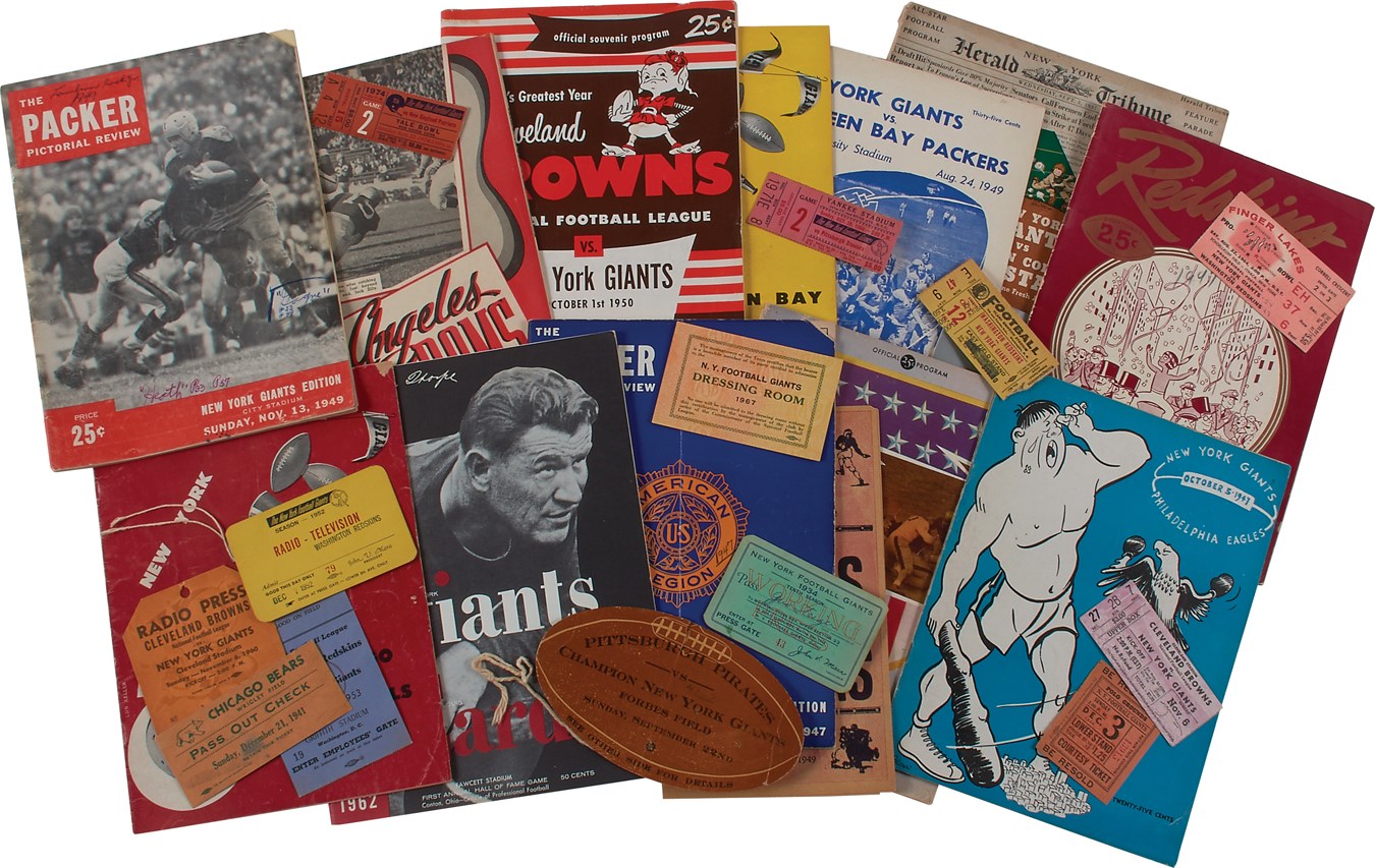 All from one dedicated collector. PROGRAMS (14): Mostly 1947 plus 1st HOF game w/Thorpe cover, 1949 Syracuse Cerebral Palsy vs. Packers. TICKETS (7): Stubs range from 1939-74, evenly distributed. PASSES (10): Range from 1941-73 w/great World Champions season pass. Plus, fantastic 1935 Pittsburgh Pirates vs. NFL Champion NY Giants at Forbes Field diecut advertising piece. Overall average is EX condition.